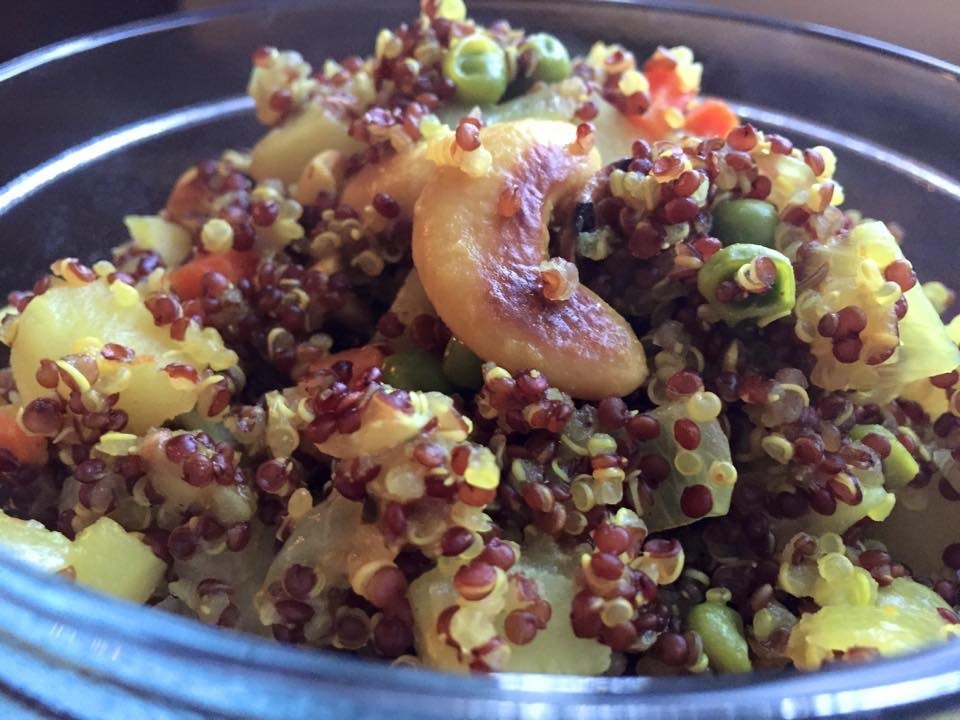 Another great recipe by Shubhra Ramineni’s Healthy Vegetarian Indian Cooking. This is makes an easy and portable lunch. Rinse, clean, and drain 1 cup uncooked quinoa, and set aside. Heat 1 Tbsp vegetable oil in a medium sauce pan, then add 20 whole cashews (split into halves). Saute until cashews are light golden (about 20 seconds), then remove from pan and set aside. Using the same sauce pan, heat 2 more Tbsp oil, then add 1 tsp cumin seeds and 1 small onion (sliced). When onion is golden brown, add 1 medium russet potato (peeled and diced), 2 medium carrots (peeled and diced), ½ cup frozen peas, the drained quinoa. Cook for 3 mins, stirring frequently. Add 1 cup + 7/8 cup water (the original recipe calls for 2 cups, which results in waterlogged quinoa for us), 1 tsp salt (see Note below), ¼ tsp turmeric, and the browned cashew halves. Bring to a boil, then reduce to a simmer. Cover and cook until grains are cooked (about 13 mins for white quinoa, 20 mins for tri-colored quinoa). Turn off heat and let rest, covered, for 5 mins. (March 2015)