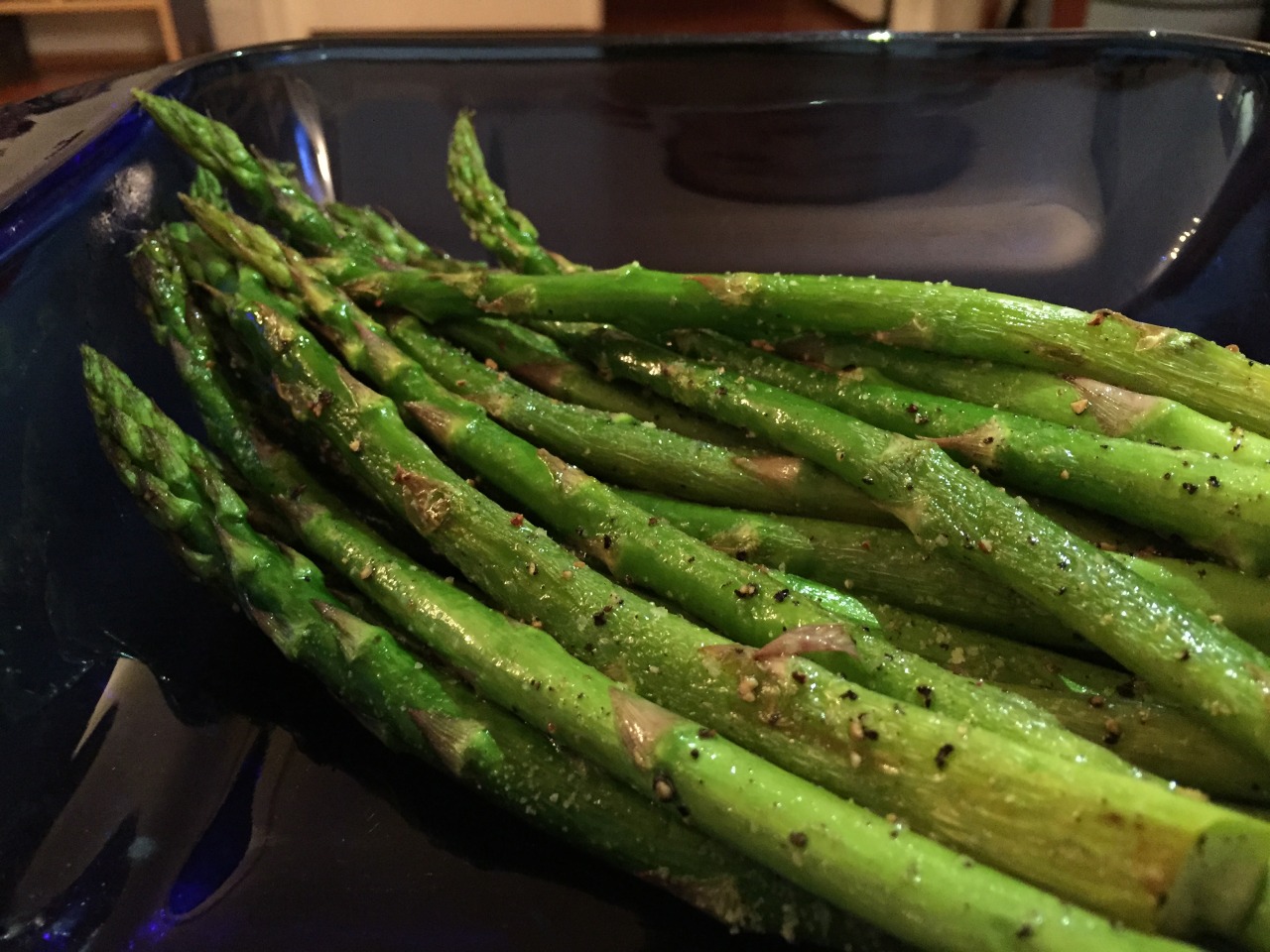 This is simple, delicious, and utterly reliable side dish that complements entrees such as soy-marinated salmon. Preheat oven to 425. Spray a cookie sheet with olive oil, then add asparagus stalks (cleaned and trimmed). Spray the stalks with olive oil, then lightly salt and pepper. Roast for 10 minutes, then serve. (Mar. 2015)