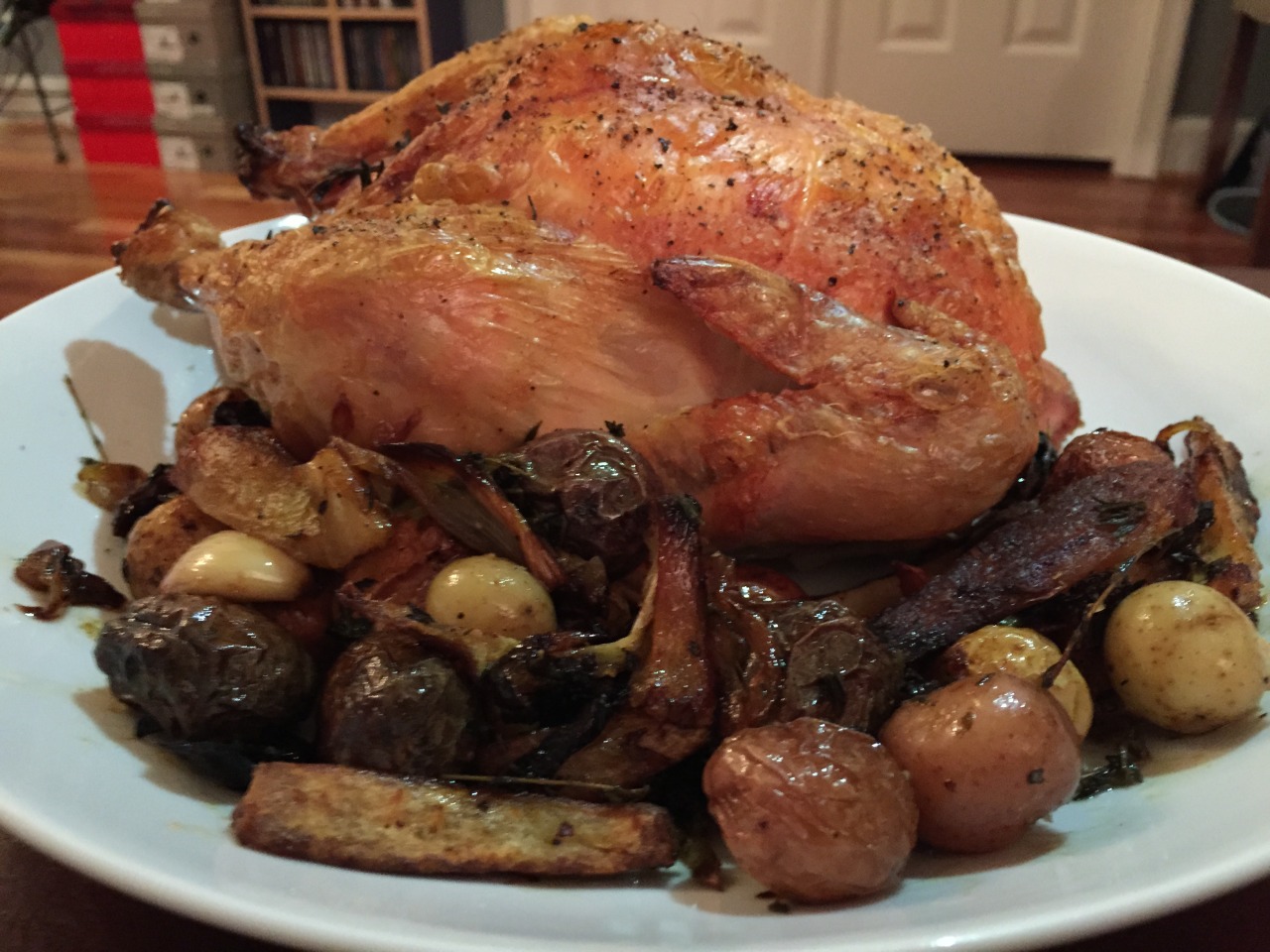 This Ina Garten recipe is our go-to roast chicken recipe: http://www.foodnetwork.com/recipes/ina-garten/perfect-roast-chicken-recipe.html Our modifications: we lined the bottom of the roasting pan with 1 lb baby tri-colored potatoes, 1 lb peeled and quartered parsnips, 10 peeled and roughly cut shallot bulbs, and 1 head peeled garlic in lieu of the fennel, onions, and carrots. (Mar. 2015)