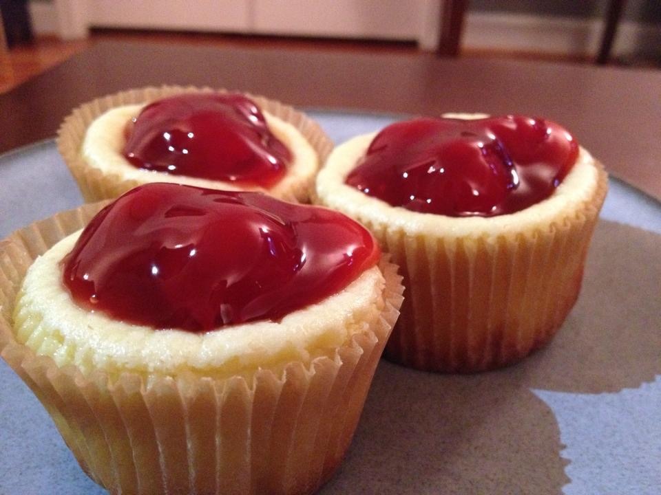 Using an electric mixer, beat 32 oz cream cheese (or, to reduce fat, 16 oz cream cheese and 16 oz Neufchâtel cheese) until fluffy, then add 2 tsp pure vanilla extract and 2 cups sugar (here, I used homemade vanilla-infused sugar). Slowly mix in 4 eggs, one at a time. Separately, place 24 cupcake liners in two 12-cup cupcake tins, then place a Nilla wafer (I used low-fat), flat side down, inside each cupcake liner bottom. Pour the cream cheese mixture into each cupcake slot, filling 2/3 full. Bake at 350 for about 25-30 mins. Let cool completely, then top with your favorite pie filling (here, cherry). Paula Deen recipe here: https://www.food.com/recipe/cream-cheese-tarts-paula-deen-114580 Note that I doubled her recipe to make the most of the pie filling. (Apr. 2014)