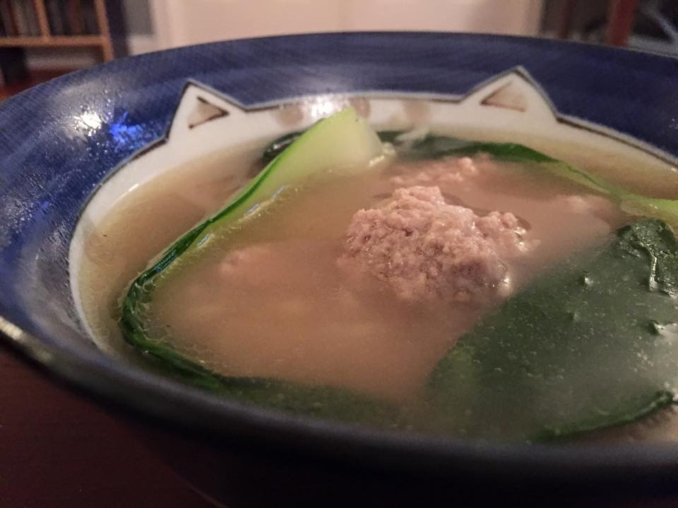 Rinse and drain 1 cup rice (here, long grain rice), then set aside. In the mean time, soak 2 Tbsp dried shrimp in ½ cup warm water until reconstituted (about 10 mins), then drain and mince. Add 2/3 lb minced pork to the minced shrimp, mixing well, then fold in 1 Tbsp Chinese cooking wine, 2 Tbsp soy sauce, 1 Tbsp corn starch, and ½ cup water. Using a large Dutch oven (see Note 1 below), heat 10 cups water (I use 5 cups low sodium chicken broth, 5 cups water), bring to a boil, then add the rice. Using a teaspoon, scoop the pork mixture into balls, dropping one at a time into the boiling soup until the mixture is gone. Lower the soup’s heat to a simmer, cover, and let cook until pork dumplings are fully cooked (about 35-40 mins). While the soup is simmering, parboil 1 head of bok choy (leaves separated and then each leaf split lengthwise) in lightly salted water, then drain. Once soup has finished cooking, add the bok choy, season to taste with salt and black pepper, and serve immediately. This recipe is from Chinese Light Meals & Snacks by Sumi Hatano. (Dec. 2014)