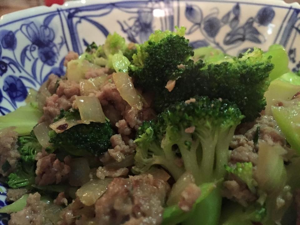 http://www.tastebook.com/recipes/3142393-Ground-Pork-and-Broccoli. Our modifications: we added chopped chives and minced garlic to the marinade and sautéed 1 chopped onion (instead of minced garlic). (Mar. 2015)