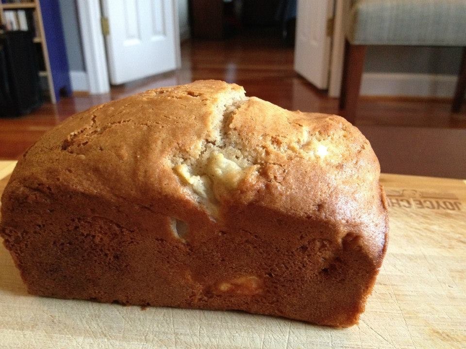 Cream 1 stick butter (room temperature) and 1 cup sugar, then add 2 large eggs and 1 tsp vanilla extract until lightly beaten. Separately, sift together 2 cups flour, 1 tsp each baking powder and baking soda, 1 tsp cinnamon, and ½ tsp. Little by little, fold the dry mixture and 1 cup sour cream (here, 7 oz plain Greek yogurt and 1 oz milk) into the batter, alternating between the dry mixture and sour cream. When the batter is well-mixed, fold in 2 pears (here, Anjou), peeled, seeded, and cut into 1 inch dice. Pour the batter (it will be thick) into greased loaf pans (here, we used 4 mini-loaves). Bake in a preheated 350 degree oven until knife comes out clean (about 45 mins). This recipe is from Quick Breads by Beatrice A. Ojakangas, with modifications (omitted the cinnamon nut topping by accident). (March 2014)