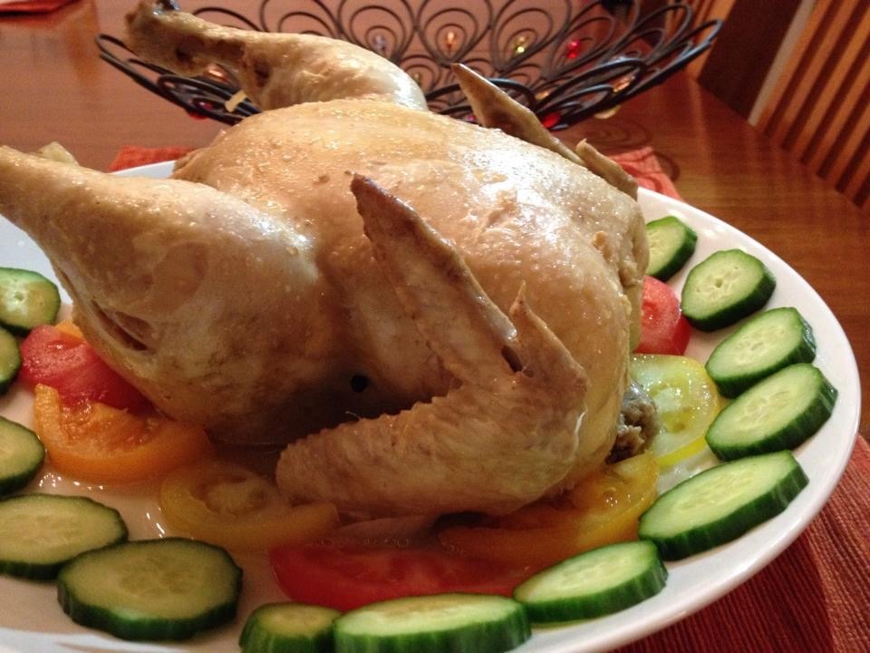 on stovetop, covered, for another 15 minutes. Remove chicken from pot and set aside, keeping warm. Season poaching liquid to taste (I added a bit of salt, pepper, and another 1 Tbsp of Maggi seasoning). In a separate, smaller pot, add cleaned and rinsed long grain rice and poaching liquid; let cook for 15 minutes. Separately, make the dipping sauce by combining 8 chopped Thai chili peppers, 3 Tbsp rice vinegar, 1 Tbsp seasoning rice vinegar, 2 Tbsp dark soy sauce (which is thicker than standard soy sauce), 2 tsp chopped garlic, 2 tsp microplaned ginger, and a dash of sugar. Serve the poached chicken with the dipping sauce, a bowl of poaching broth, the chicken rice, and some cucumber and tomato slices. This is from The Food and Cooking of South China by Terry Tan, with modifications (doubled all aromatics in poaching liquid, added Maggi seasoning to poaching liquid, and added sugar to dipping