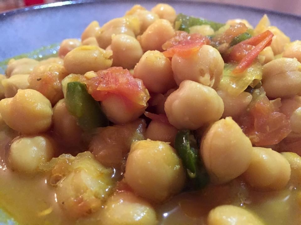 Before starting to cook, toast ¾ tsp cumin seeds in a small, ungreased pan until fragrant (do not burn), then grind using a mortar and pestle. Set aside. Using a medium sauce pan, heat 3 Tbsp vegetable oil, then add ½ small onion (grated), 1 Tbsp microplaned ginger, and 2 minced garlic cloves. When fragrant and onion is gold brown, add 1 ripe tomato (thinly sliced into half-moons) and stir until tomato has melted into the onion mixture. Add the ground toasted cumin seeds, ¼ tsp each turmeric and cayenne pepper, ¾ tsp salt, a ½ tsp ground black pepper, and 1 jalapeño (seeded and cut into half-moon slices). Stir frequently, cooking uncovered for 6 mins. Add 30 oz canned chick peas with liquid and ¼ cup water. Bring to a boil, then reduce to a simmer. Cook uncovered until flavors meld (about 15 mins). Recipe from Healthy Indian Vegetarian Cooking by Shubhra Rahimeni. (May 2015)