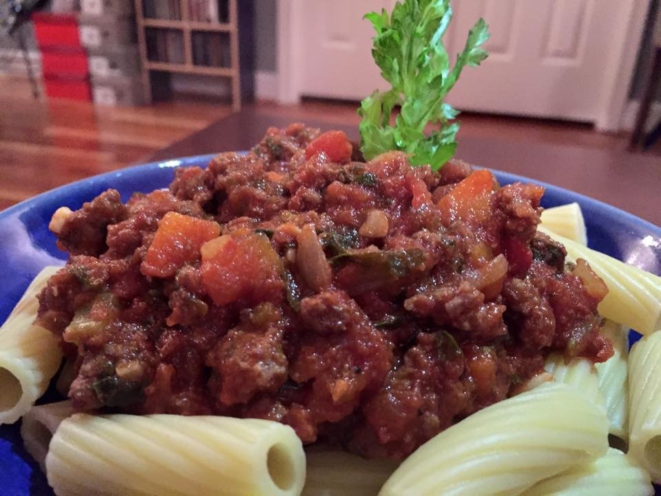 Recipe is here: http://www.foodnetwork.com/recipes/giada-de-laurentiis/simple-bolognese-recipe2.html I often modify by doubling the amount of garlic, carrot, and celery, adding about 3 Tbsp tomato paste (for depth), and towards the end, I add 1 Tbsp of vinegar (red wine or balsamic) for brightness. (Jan. 2015)
