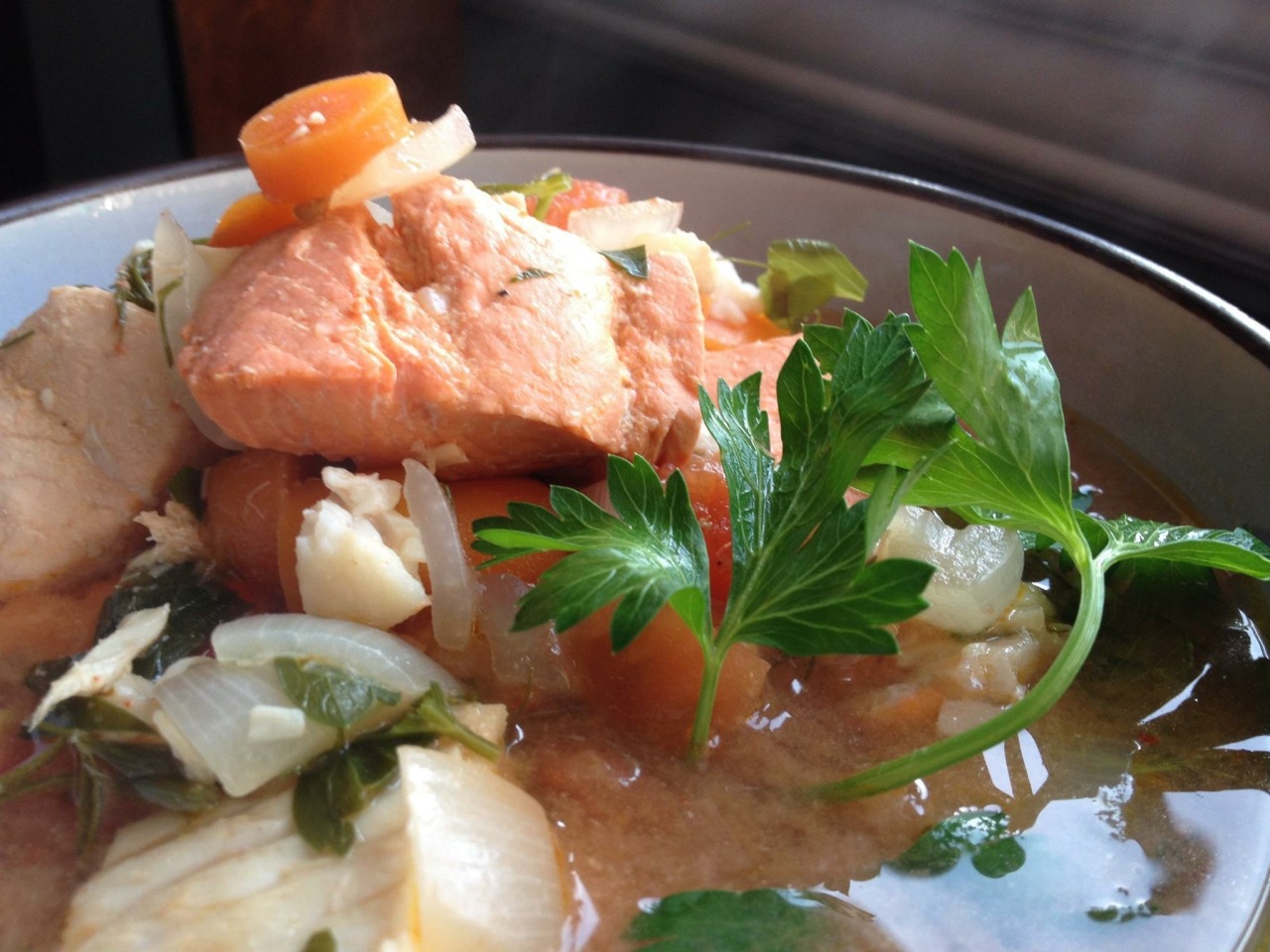 This recipe is loosely based on a recipe from Zuppa by Anne Bianchi. Saute 2 chopped onions, 6 cloves minced garlic, and ½ lb chopped baby carrots. When wilted, add 3 Roma tomatoes (chopped into large chunks), several sprigs fresh thyme (leaves only), 1 sprig rosemary, a few sprigs sage, several sprigs chopped fennel fronds, and 1 cup chopped fresh parsley. Add 2 quarts fish broth, then gently