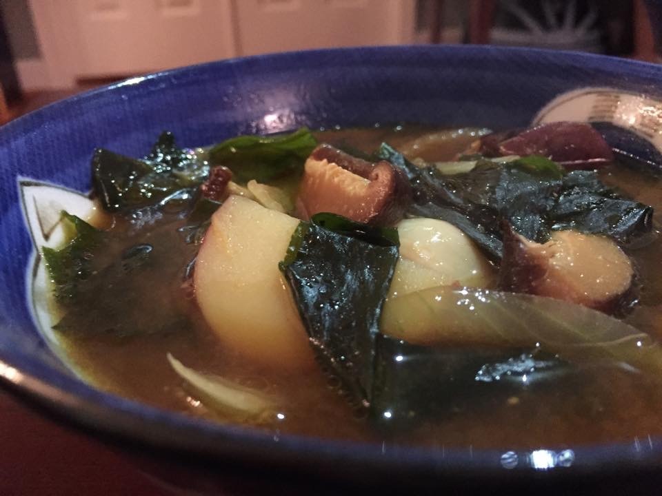 Soak about 1-2 oz dried wakame seaweed in room temperature water and set aside. Saute 1/2 lb lean beef (cut into bite-sized pieces) in a little oil. When browned, add 5-6 shiitake mushrooms (fresh or reconstituted dry), cut into ½” slices Sauté until fragrant, then add 2 large Yukon potatoes (or 1 large Russet potato) cut into large, bite-sized chunks (here, I added 6-7 small tri-colored potatoes, halved), sauté, and then one onion (sliced) and several garlic cloves (sliced). Add hot water (or the mushroom soaking liquid) to nearly cover most chunky ingredients (about 10 cups total). Mix in about 2 Tbsp
