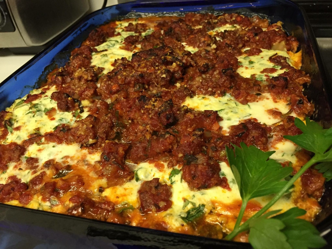 We made this based on Ina Garten’s Turkey Lasagna recipe (here at http://www.foodnetwork.com/recipes/ina-garten/turkey-lasagna-recipe2.html), except that we substituted the minced turkey with 1 lb minced beef and 2 hot Italian pork sausage links (casings removed). (Dec. 2014)
