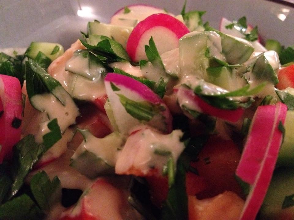 Toss together 2 cups chopped cucumber, 1 cup red radish (cut into half-moons), ½ cup diced bell pepper, and 1 cup chopped parsley. Mash together 2 cloves garlic and 1 tsp salt, then whisk in ¼ cup tahini and 5 Tbsp lemon juice. Pour dressing over salad and serve. This recipe is from Classic Lebanese Cuisine by Kamal Al-Faqih, except we omitted tomatoes and scallions. (Oct. 2014)