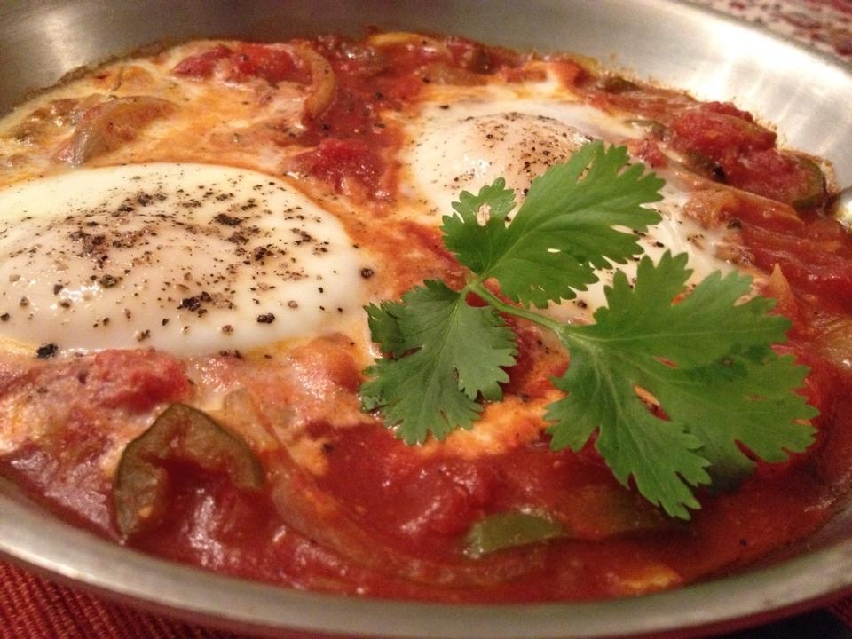 Heat 3 Tbsp olive oil in a large skillet, then add 1 sliced onion and 2 sliced, seeded jalapenos. Cook gently until soft, then add 3 cloves minced garlic. In a minute, add 1 tsp each cumin and sweet paprika as well as a dash of cayenne. Stir, then add a 28 oz can of coarsely chopped plum tomatoes with their juice. Season with salt and black pepper, then simmer uncovered until sauce reduces (about 10 mins). Spoon 2 servings’ worth of sauce into a separate, smaller sauce pan, and heat to a simmer. Gently break two eggs into the heated sauce, then place in a preheated 375 degree oven until eggs are set (about 7-10 mins). Serve with crusty bread (we used sliced, toasted ciabatta). This recipe is from Shakshuka with Feta by Melissa Clark, available at cooking.nytimes.com (we skipped the feta). (Sept. 2014)