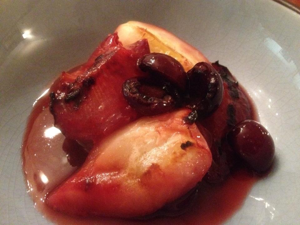Preheat oven to 450. Cut 6 peaches (here, white nectarines) and 6 plums into quarters (removing pits), then place cut side up in a large baking dish. Sprinkle ½ cup sugar (here, I used homemade vanilla sugar) over the stone fruit. Garnish with 2 small containers of pitted cherries (or raspberries), then place in the middle rack of the oven for about 20 minutes. Then turn on the broiler, and place the fruit under the broiler until it releases its juice (monitor this stage carefully; I did not and it got a little charred). Remove from oven, the sprinkle with 2 Tbsp orange juice and serve. This was a refreshing and simple dessert, perfect for the summer. This recipe is from Ina Garten and available on Food Network. (July 2014)