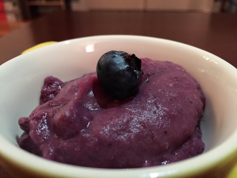 An easy and healthy dessert. Recipe is here: http://www.foodnetwork.com/recipes/tyler-florence/roasted-banana-and-blueberry-puree-recipe.html. We added 1 tsp vanilla-infused sugar while pureeing. Somehow this reminds me of puréed camote, a purple yam I enjoyed in Mexico. (Feb. 2015)