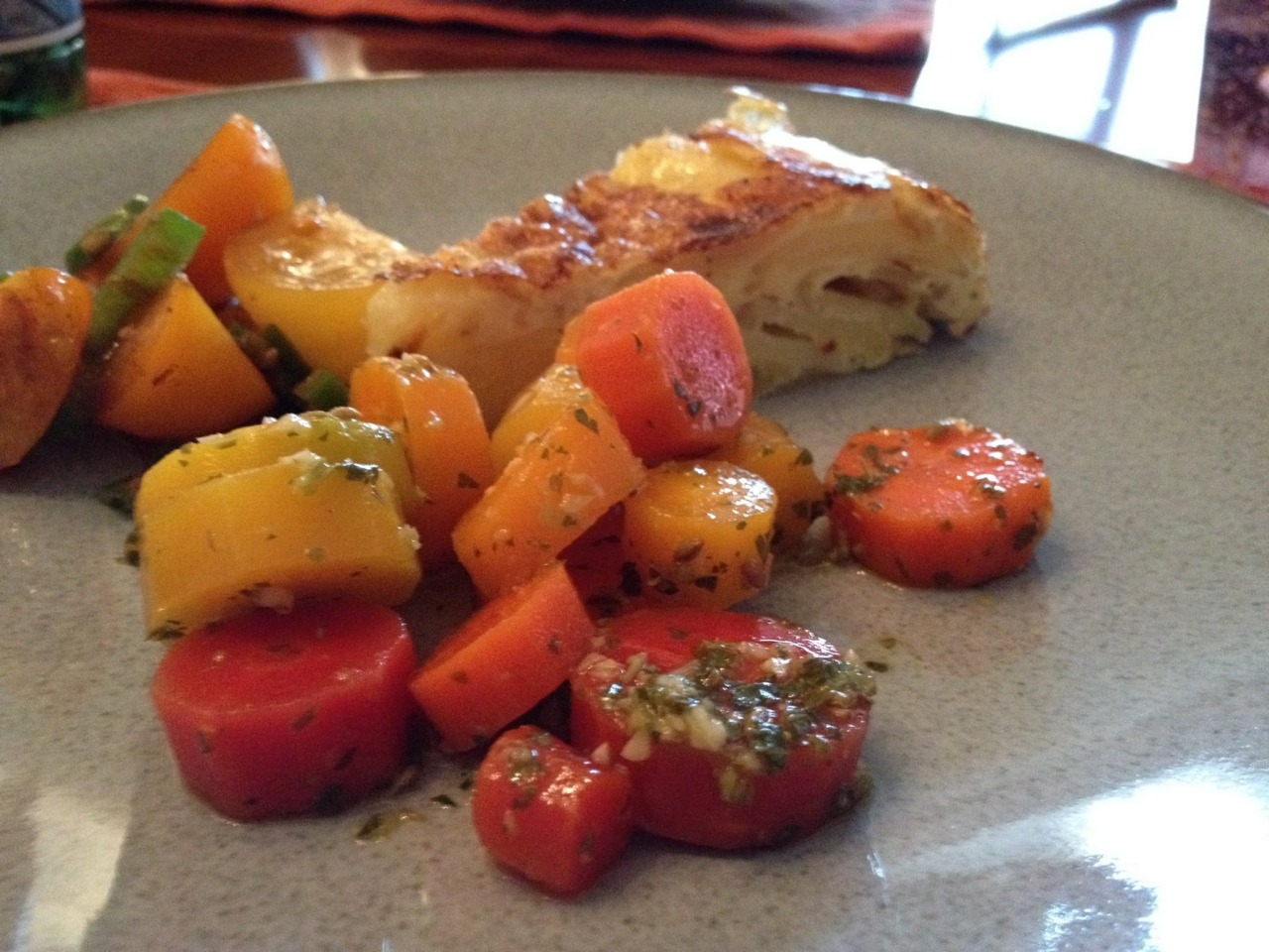 Spanish tortilla, Seville marinated carrots, and spiced marinated tomatoes. (May 2014). Recipes for each of these are available as separate blogposts.