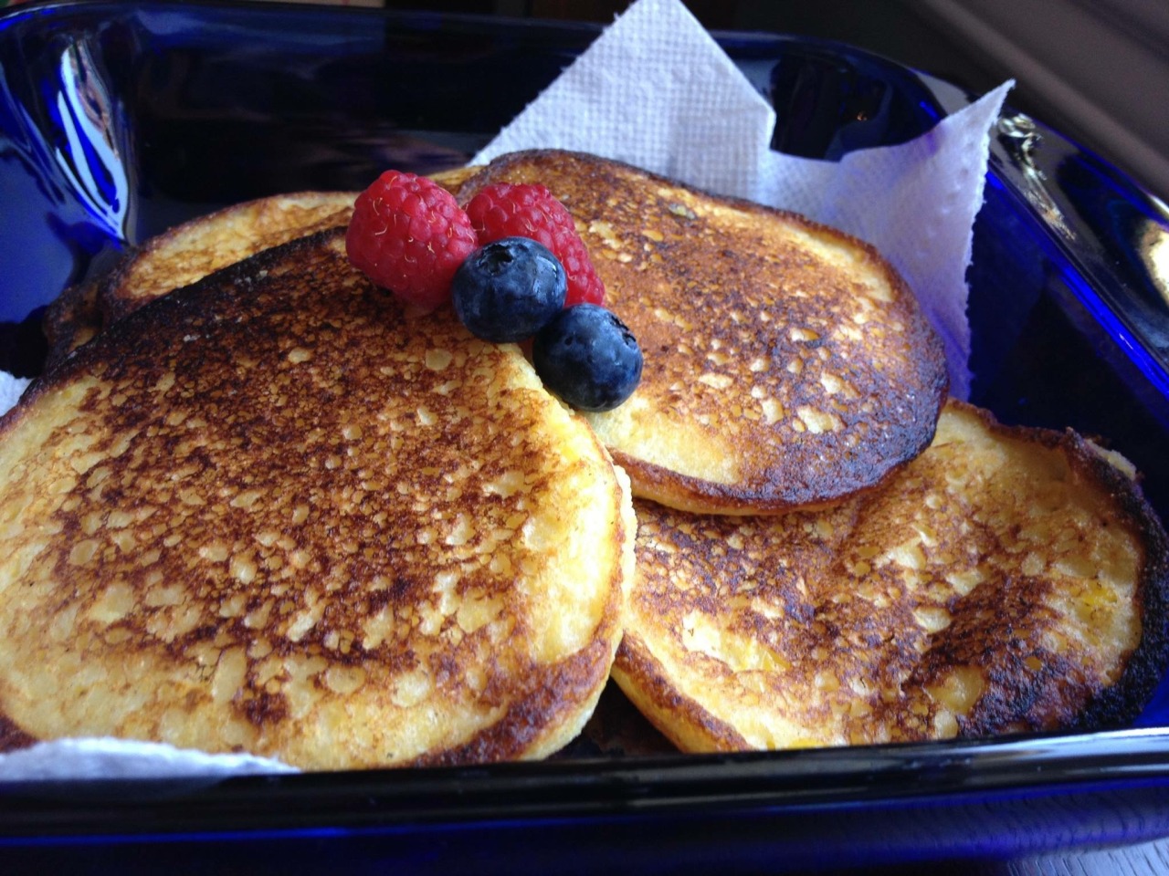 I have been on a cornmeal kick for the past few days, so we decided to try out this recipe. Mix ½ cup cornmeal with 1 ¼ cups buttermilk, then set aside. Separately, puree 2 cups corn kernels in a food processor, then add 2 eggs and 2 Tbsp butter (melted but not hot) and mix well. Add the cornmeal mixture and mix briefly. In another bowl, sift together ½ cup flour, 1 tsp baking powder, ¼ tsp baking soda, and ½ tsp salt. Fold the dry ingredients into the wet mixture, then add any additional ingredients (here, I added 1 tsp maple syrup). Heat a lightly greased cast iron pan (I used a combo of butter and vegetable oil to mitigate smoking), then pour the batter in by the ladle. Brown on one side, then flip over for a few mins, and then place on power towel. Serve with maple syrup, fresh fruit, and some bacon. This recipe is from Crazy for Corn by Betty Fussell. (May 2014)