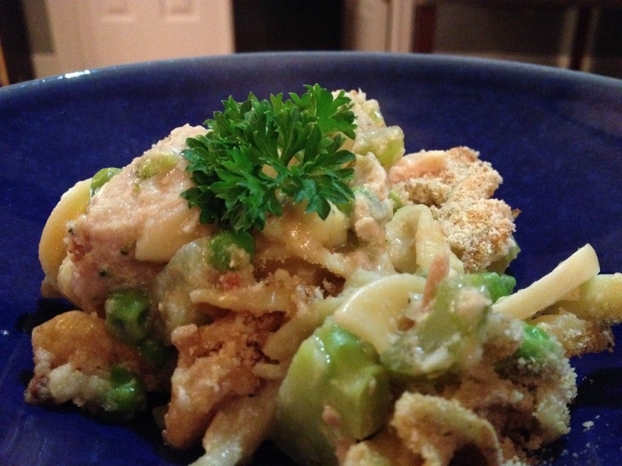 vigorous simmer. Once sauce has reduced by ½ cup, add 10 oz each frozen broccoli and peas. When vegetables have partially defrosted, add drained tuna from four 6-oz cans and the cooked pasta. Mix well, then pour into a 9×12 baking dish. Sprinkle generously with unseasoned bread crumbs, then bake for 25 mins. This recipe is based on a healthier version of this dish by Elie Krieger, with additional seasonings from a recipe by Sunny Anderson; both are available on Food Network. (May