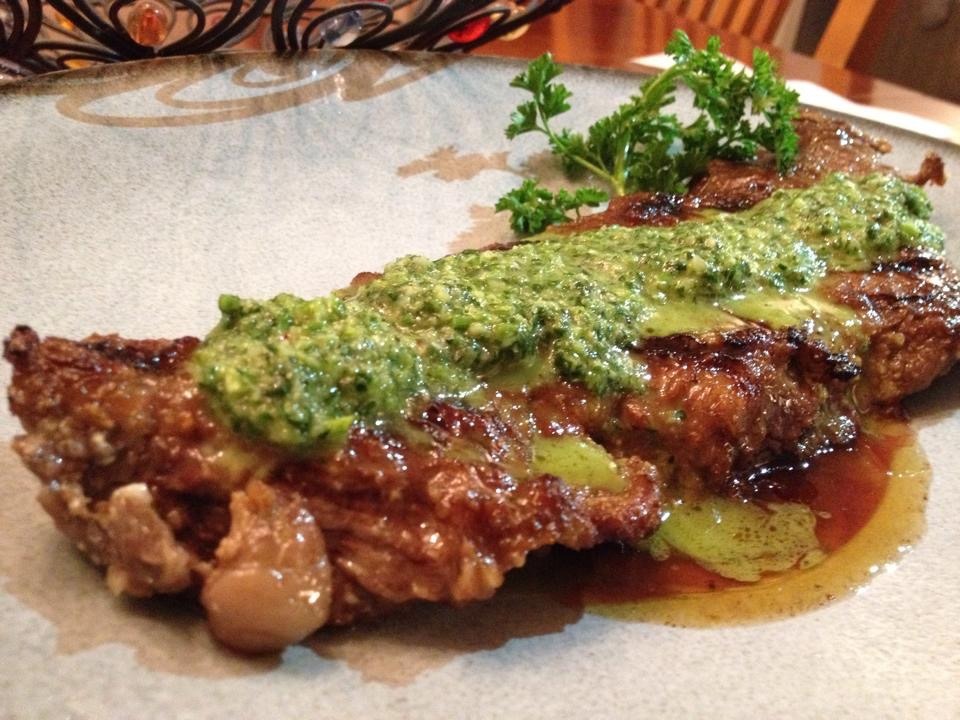 Inspired by our meal at Jimmy’z Kitchen in Miami, we decided to try out this dish at home. Its origin is Argentinian, but it is popular in a lot of Latin American cuisines. First, prepare the marinade (mojo): Place peeled garlic cloves from 2 bulbs, 2 tsp salt, 1 tsp whole black peppercorns, and 1 onion (rough-cut) in a food processor. Blend until pureed, then add 1 ½ cups sour orange juice (here, ¾ cup orange juice plus the juice from 2 limes and 2 lemons), 4 sprigs fresh marjoram. Let the mixture sit for 30 mins. In the mean time, heat 1 cup of olive oil in a small pot until hot (but not boiling). Whisk the citrus mixture into the oil, then let cool; this is your mojo. Pour the mojo over skirt steaks (we used three ½ lb steaks) and let marinate for at least 5 hours. Second, while the meat is marinating, make the chimichurri: place ½ bunch cilantro, ½ bunch curly parsley, 8 cloves garlic, the juice of 2 limes and 1 lemon, ½ tsp crushed red pepper, and some salt and pepper in a blender. Puree, then whisk in 2/3 cup olive oil (I added it to the food processor, which may have been a mistake because it emulsified). When meat is ready, pan-sear it in a grill pan (it took about 15 minutes for one steak to cook medium well), then pour the chimichurri over top. Serve with rice and fried plantains. The churrasco recipe is from Three Guys from Miami Cook Cuban. The chimichurri recipe is based on that cookbook, with modifications (omitted vinegar, onion, and oregano, increased citrus juice). (Jan. 2014)
