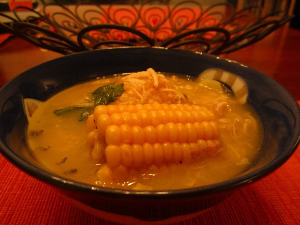 This recipe is based on Ajiaco Bogotano in the March 1, 2006 issue of the Washington Post (chicken stock) and Secrets of Colombian Cooking by Patricia McCausland-Gallo (beef stock/corn prep and potato ratios). Also, the proprietor of the El Encanto Grocery in Arlington, who is Colombian, advised me to use the guasgas judiciously, only 2 Tbsp for this entire pot. (June 2013)