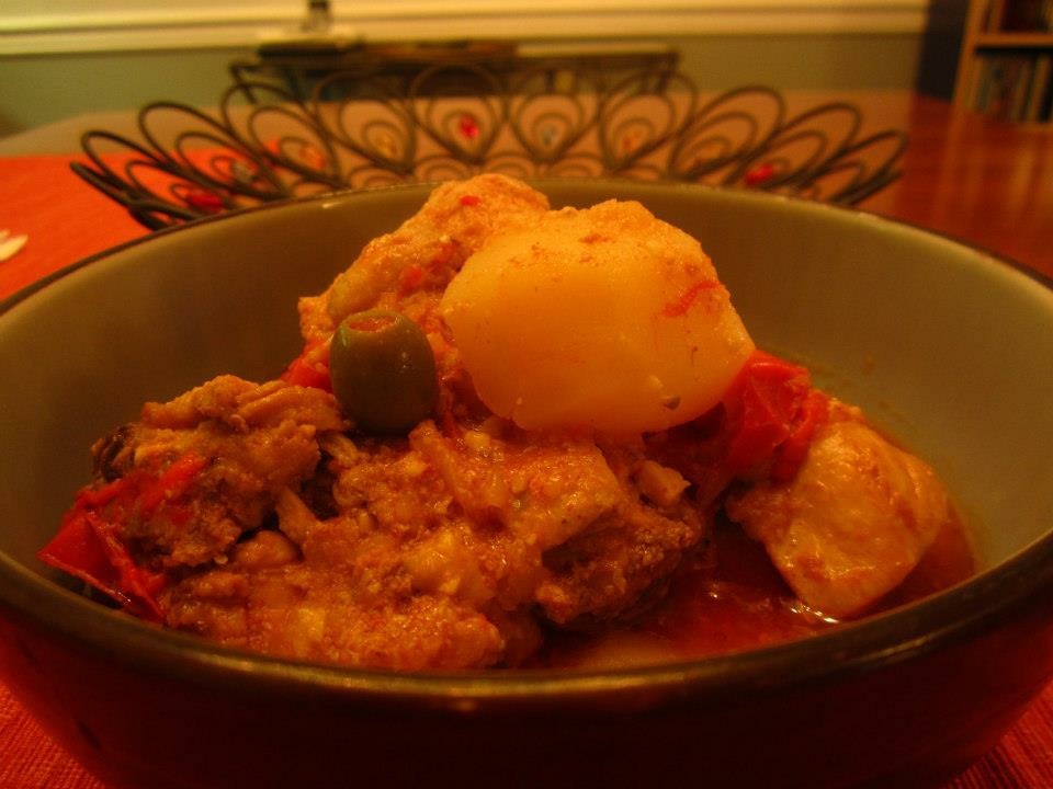 This is a family recipe from my friend Annette. Marinate 3-4 lb whole chicken, cut up (skin-on, bone-in) in a mixture of 1 large sliced onion, 1 sliced bell pepper (I used red, not green), 3 garlic bulbs (minced), 1 tsp Spanish red pepper powder (aka pimenton), 1 tsp dried oregano, 1 tsp ground cumin, and 1 bay leaf for about a half hour. Using a large Dutch oven, heat 3-4 Tbsp olive oil, then gently cook the chicken pieces until browned. Add 2.5 cups water, ½ tsp Spanish paprika (I used a combination of pimenton and molido), and 1 Tbsp salt (I reduced to 1 tsp). Cover and cook on medium for about 20 minutes. Add 1 lb potato (peeled and cut into large chunks, perhaps 4 chunks per medium potato), ¼ cup tomato sauce (no-salt), and ¼ cup white cooking wine. Cover and cook on medium until potatoes are soft (about 15 mins). Add about 15 drained olives stuffed with pimiento, and then serve with rice. (Apr. 2013)