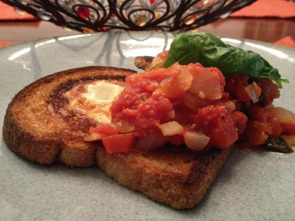 I woke up with a sudden craving for this breakfast dish from a scene in the film, Moonstruck. It involves two components: marinara sauce and an egg fried in a slice of bread. First, the marinara sauce: I had to improvise here with whatever we had in our pantry and balcony garden. Heat olive oil in a wok, then add chopped onion and minced garlic. When fragrant, add chopped fresh tomatoes (here, I added half of a tomato, thinly sliced, and a 14.5 oz can of Muir Glenn diced petite tomatoes), oregano (here, fresh marjoram), julienned Italian basil, and a dash each crushed red pepper, salt, and black pepper. Let cook, uncovered, at a slow boil until sauce reduces (about 15 mins). Separately, cut a hole in two slices of wheat bread (I used a small drinking glass). Save the slice and the circle. Heat a large cast-iron pan with a mixture of olive oil and unsalted butter, then gently place the two slices and two circles so that they have full contact with the hot pan. Carefully break an egg into each of the holes. Let cook until browned on one side, then gently flip over. If you like your egg yolks runny (as I do), remove your egg in a nest immediately and then garnish with a generous serving of marinara sauce. If you like the egg yolk more cooked, keep it in the pan, and shut off the heat (it will continue to cook) to avoid smoking up your kitchen. Serve immediately. The marinara sauce is loosely based on Sauces for Pasta by Kristie Trabant et al. The eggs in a nest is something I learned along the way. (Oct. 2013)