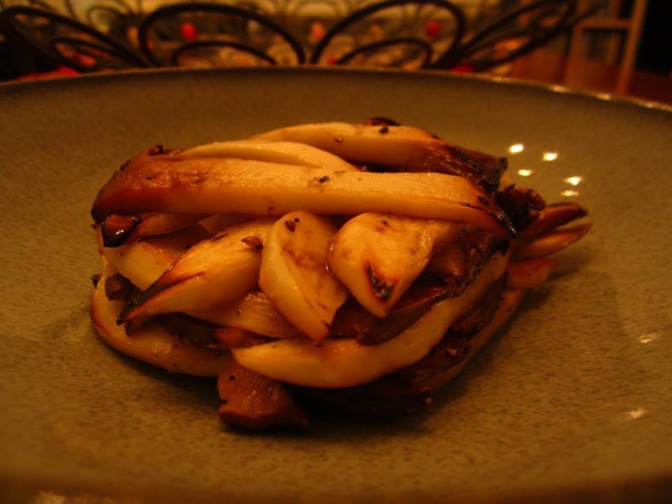 I came across this recipe at a Korean supermarket, where they were doing a cooking demonstration. Heat oil (sesame oil is recommended) in a sauté pan, then add king oyster mushroom (cut into slices). Season with salt and black pepper, and then let brown on each side. (May 2013)
