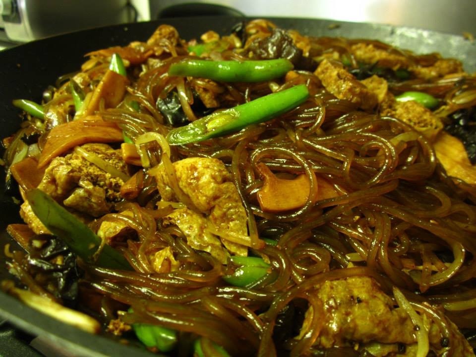 I made this dish for Kai, who loves cellophane noodles. Boil sweet potato noodles (aka cellophane noodles, or dang myun) until tender, then drain, rinse with cold water, and set aside. Heat oil in a large wok, then saute minced garlic and sliced onion until wilted. Add mungbean sprouts, Chinese long beans (here, green beans cut on a diagonal), bamboo shoots (cut into thin slices), and black wood-ear mushrooms (reconstituted and sliced) and continue to sauté. Mix in 3 Tbsp each hoisin sauce, oyster sauce, dark soy sauce, and 4 Tbsp toasted sesame oil. Then add pre-fried tofu squares (cut into slices) and the cooked cellophane noodles, tossing to mix well. Add a little water, then continue to sauté. Season to taste as necessary (here, I added 4 Tbsp Marukan Seasoned Gourmet Rice Vinegar Salad Dressing and 2 Tbsp Chunkiang Vinegar for brightness). Serve room temperature, preferably as a side dish to a main protein like grilled chicken or pork. This recipe is from The Food and Cooking of Southern China by Terry Tan. (June 2013)