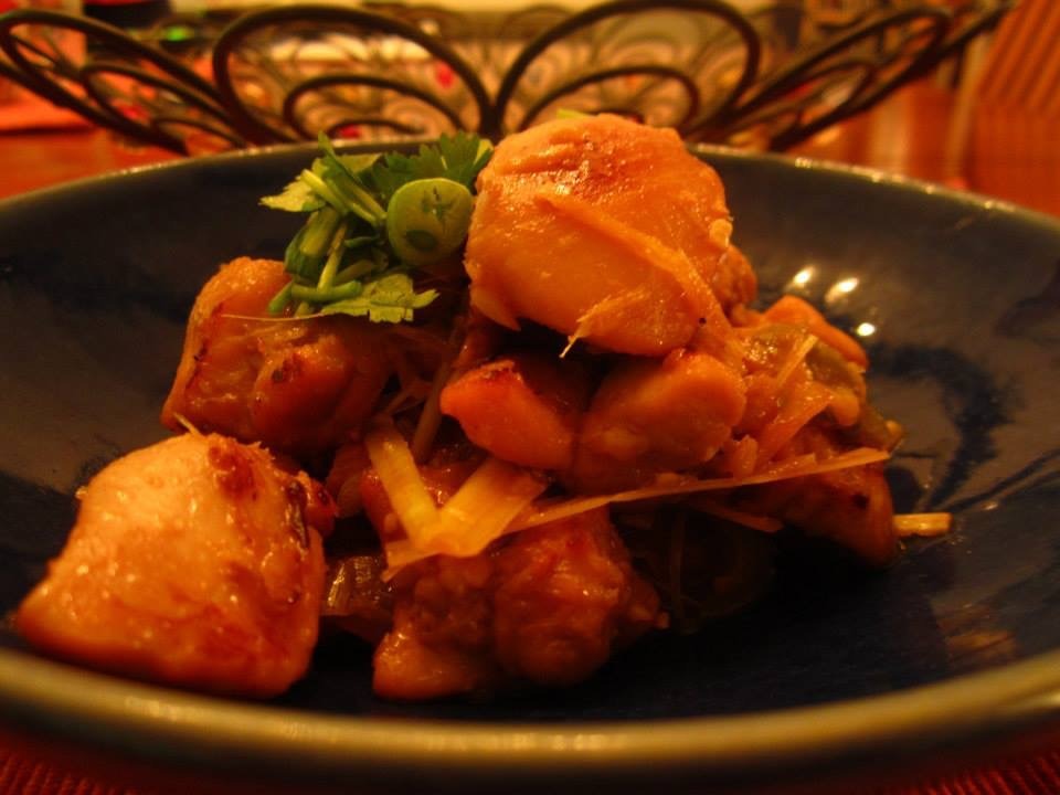Marinate boneless, skinless chicken thighs (cut into chunks) with salt, black pepper, and one finely minced lemonstalk. Set aside. Separately, heat 2 Tbsp neutral vegetable oil until shimmering, then add 2 Tbsp sugar; stir constantly on medium-high heat until caramelized. Then add sliced onion, minced garlic, and 3 lemongrass stalks (pounded and bruised). Saute until fragrant, then add chicken (here, the recipe suggests adding a little water, but I would disagree, as it prevents the chicken from browning). When chicken is cooked, add fish sauce (here, I would disagree as well – the next time I will add the fish sauce to the marinade so that the chicken will absorb it). Garnish with fresh cilantro and scallions, then serve with jasmine rice. This recipe is from The Asian Grandmothers Cookbook by Patricia Tanumihardja, with modifications (I removed the chicken from the sauce and separately browned the pieces in a pan, then returned the chicken to the pot for a few minutes before serving). (June 2013)