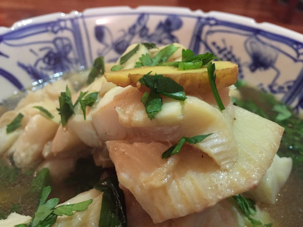 This is based on Hot and Sour Shad Soup in The Key to Chinese Cooking by Irene Kuo. Despite the recipe title, we found the dish neither hot nor sour. We modified by adding more aromatics to the steam pot and to the chicken broth. (Mar. 2015)