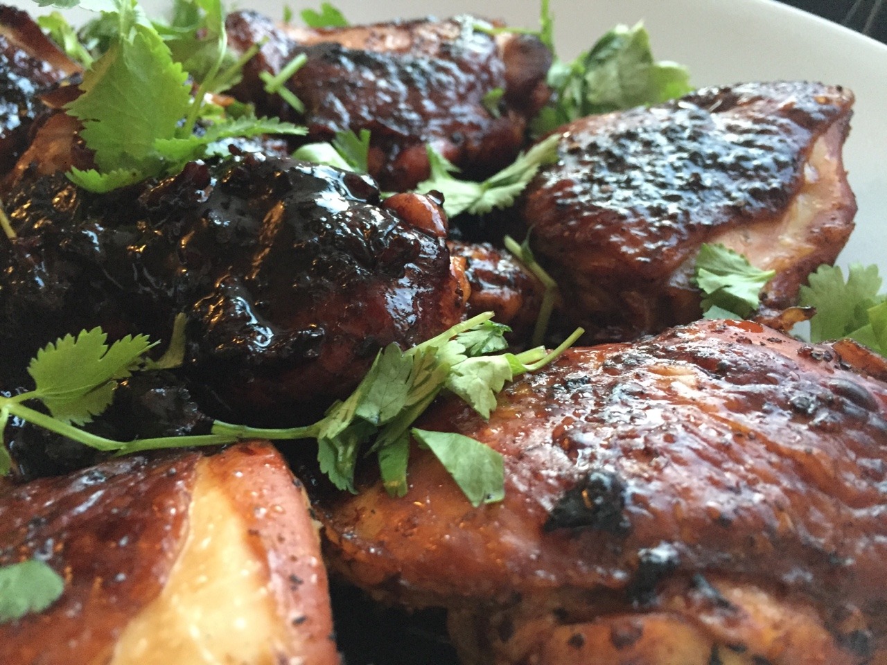 Four ingredients (chicken, dark soy, black pepper, and cilantro) create a delicious meal. Combine 2 Tbsp dark soy and 1 Tbsp black pepper in a wide sauté pan. Place 2 lbs (about 6-7 pieces of skin-on, bone-in chicken thighs, trimmed off excess fat) of chicken thighs in the pan, making sure to get the sauce all over the chicken (and try to get it b/w the skin and flesh, if possible). Once chicken is coated, place each piece skin side down. Cover and cook on medium-low heat until you hear gentle bubbling, then reduce heat to low and cook for an additional 15 mins. Turn the chicken pieces over (so that the skin is on top), then cover and cook on low heat until chicken is fully cooked (about 20-25 mins). Garnish with cilantro and serve with rice. More details and the actual recipe available at http://www.vietworldkitchen.com/blog/2012/12/soy-glazed-black-pepper-chicken-hakka-cookbook.html (Apr. 2015)Note: Dark soy has a lot of sodium, so to make this lower sodium, we have cut the dark soy down to 1 Tbsp and spray the inner pan with some oil to make up for some of the moisture.