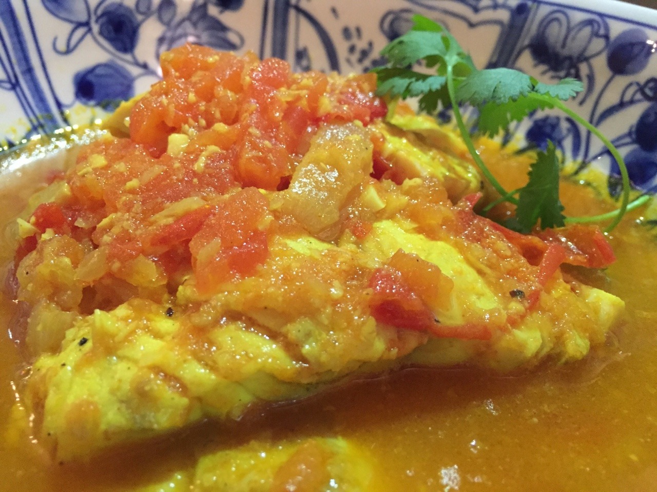 We used sea bass filet for this recipe from Entice With Spice by Shubhra Ramineni. We also added a dash of fish sauce at the end of cooking. Details to come. (May 2015)