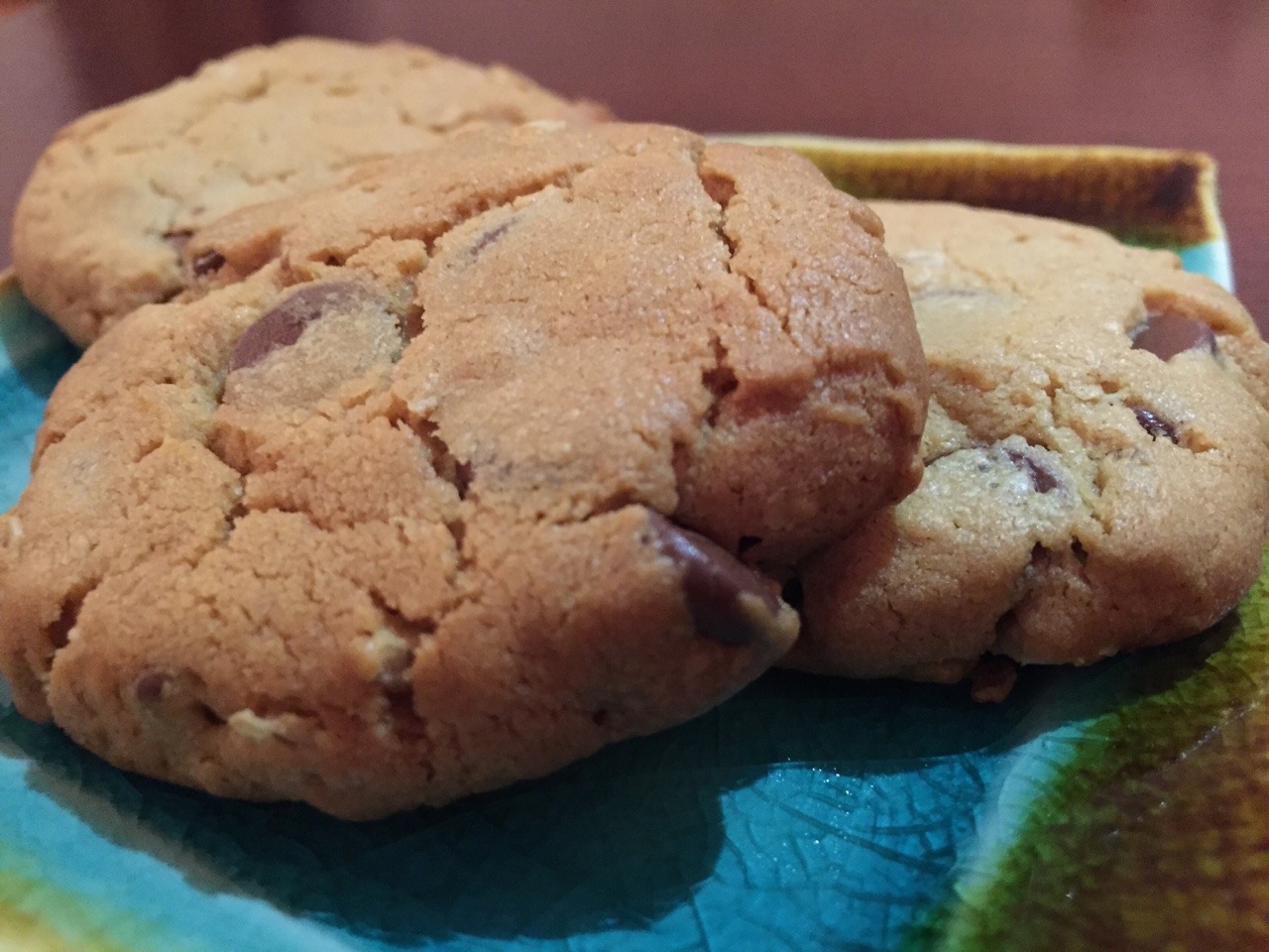 Note: In a later version, we used light brown sugar instead of turbinado. We reduced the dark chocolate chips to ¾ cup and supplemented with ¼ cup roughly chopped unsalted roasted Virginia peanuts. We placed a whole peanut or peanut half in the center of each cookie before baking. (Aug. 2020)