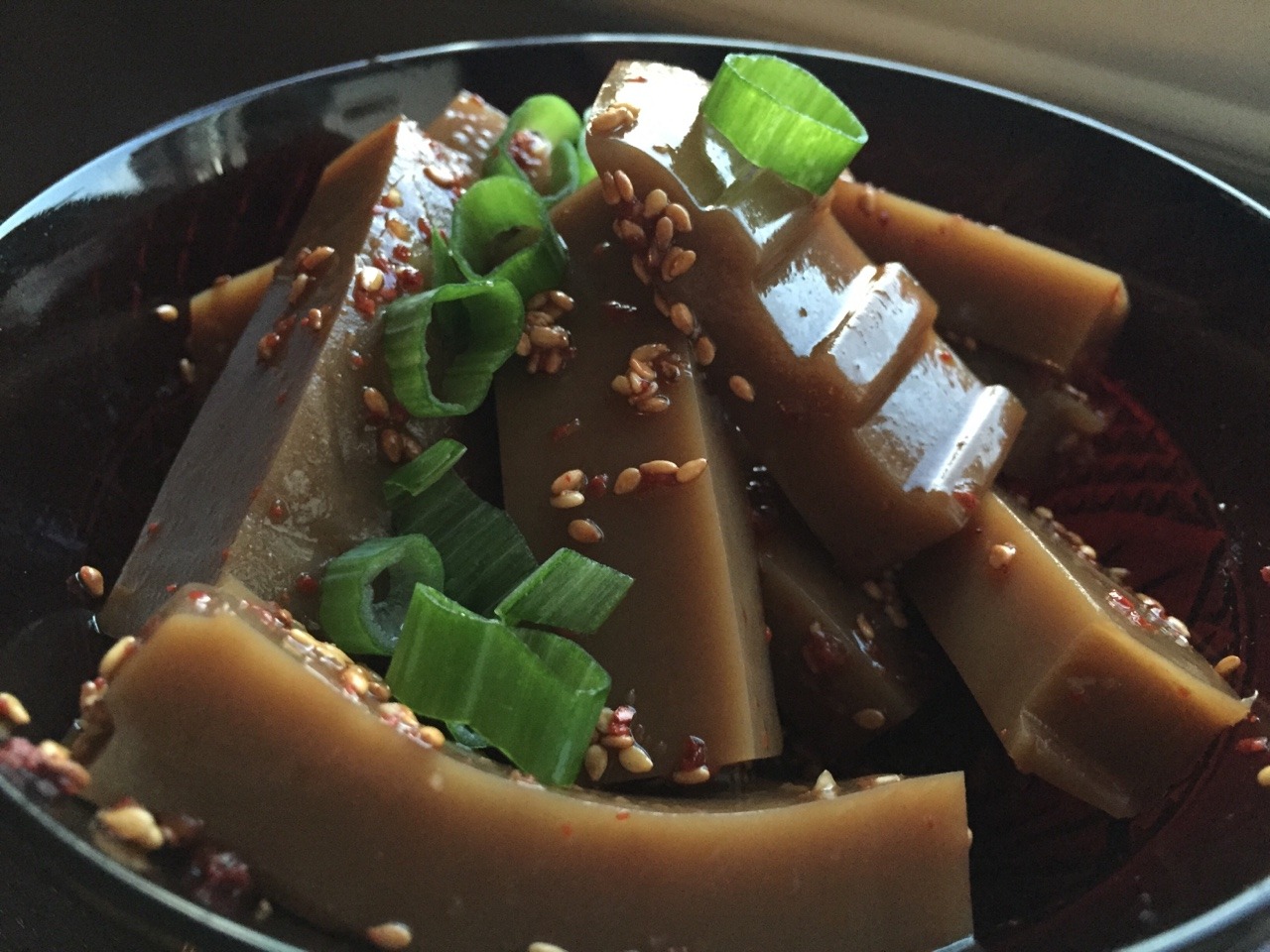 I simplified this recipe from Maangchi: http://www.maangchi.com/recipe/dotorimukmuchim. I used store-bought acorn jelly, cut it into bite sized pieces, and then tossed with 2 Tbsp soy sauce, 1 Tbsp toasted sesame oil, ½ tsp sugar, a few minced garlic cloves, and 1 tsp sesame seeds. Garnished with 1 tsp chopped scallion greens. (June 2015)