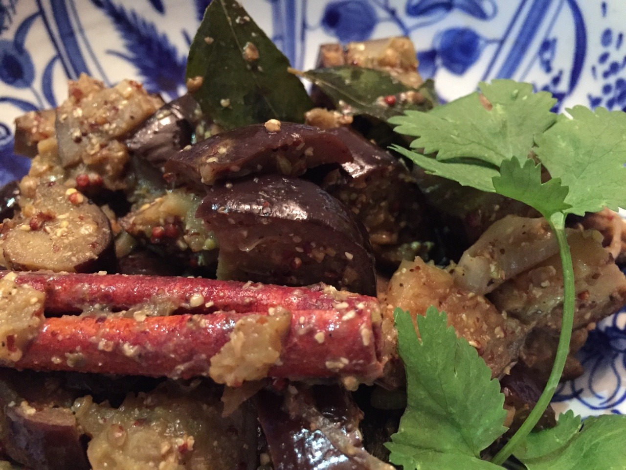Cut 1 lb eggplant (about 2 medium) into ½ inch rounds. Lightly spray a baking dish with olive oil, then place eggplant pieces on it, spray the pieces, and then broil for about 7 mins total (turning over the pieces midway) until each side is a browned. Cut each round into quarters. Toss the quartered eggplant pieces with: 1 tsp each cumin and coriander; ½ tsp each ground fennel, cayenne, and salt; ¼ tsp ground turmeric; and 4 tsps (1 Tbsp + 1 tsp) fresh lime or lemon juice. Separately, heat 1 Tbsp neutral oil in a large wok, then add 1 cinnamon stick and 15 fresh curry leaves. Stir once and then add 1 small onion, chopped. When fragrant, toss in the seasoned eggplant pieces, including any remaining sauce. Saute for 4 mins, then add ¾ cup coconut milk and 2 tsp ground brown mustard seeds. When it starts to bubble, reduce heat to medium low and cook, uncovered, for 3 mins (note: the eggplant will absorb most of the coconut milk, so there won’t be much sauce). Season to taste with salt, cayenne, and lime juice. Serve with basmati rice. This recipe is from World Vegetarian by Madhur Jaffrey (July 2015)