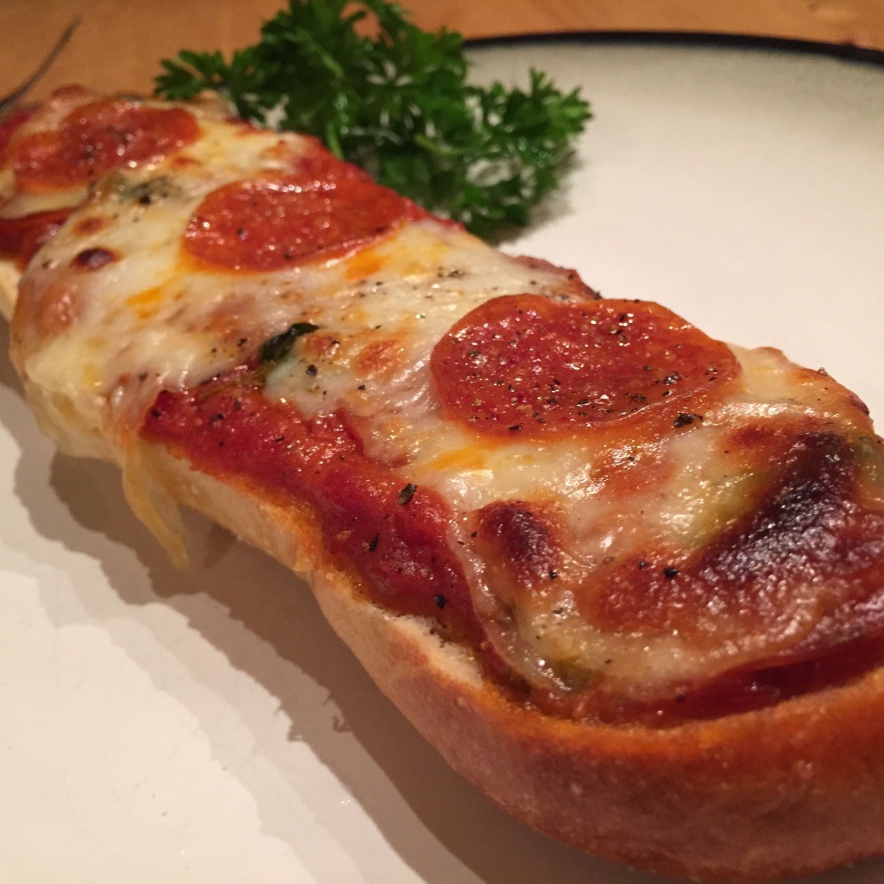 This is a clever riff on Stouffer’s frozen pizza, using store-bought ingredients that you assemble. Preheat oven to 350. Line a rimmed baking sheet with foil, place a baking rack on top of the foil, then lightly spray the rack with oil (the rack will stabilize the uneven baguette crust and the oil will make clean-up from spilled cheese easier). Place a baguette (cut in half crosswise, then cut in half lengthwise, resulting in four long pieces), cut side up, on a cookie sheet in the middle rack of the oven for 5-7 mins. Then spread 1 ½ to 2 cups (13 oz) store-bought pizza sauce such as Rao’s on the cut side of the baguette (about ¼-½ cup per piece). Layer on 2 oz pepperoni slices (about 6 slices per piece, plus more for garnish), 8 oz sliced fresh mozzarella (about 2 oz per piece), ½ cup grated Parmesan (which we skipped), and ½ tsp dried oregano (we used some fresh marjoram leaves instead). Garnish each piece with about 3 pepperoni slices, then sprinkle with freshly ground black pepper. Bake on center rack for 20 mins, then switch oven setting to broil. Move the cookie sheet to the top rack of the oven, letting pizza pieces brown on top (1-2 mins), then serve immediately. (Note: try to keep the baguette pieces steady on the cookie sheet so that the toppings do not slide off.) We served our pizza with a simple salad. Recipe from Sheet Pan Suppers by Molly Gilbert. (July 2015)