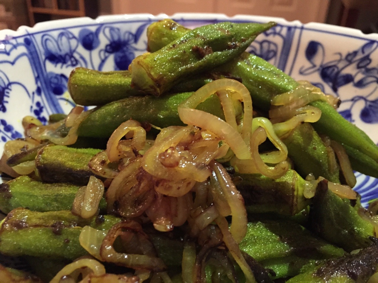 First, combine 2 ¾ tsp each turmeric and black pepper, 1 ¾ tsp salt, and 1 ¼ tsp cayenne in a small bowl. Second, wash and trim 1 lb okra. Carefully cut a slit into each okra pod, then using a teaspoon, gently stuff each okra pod with the seasoning mix (about 1/8 tsp per pod) and set aside. Third, heat a large wok with 5 Tbsp oil, then when heated, add the stuffed okra. Sauté on high for 10 mins, then reduce heat, cover, and let cook until tender (about 5 mins). Remove okra and place in a serving dish. Add 1 more Tbsp of oil in the wok, then add a small onion (here, a shallot), sliced crosswise. Sauté until browned, then place on top of the okra and serve. Recipe from Healthy Vegetarian Indian Cooking by Shubhra Rahimeni (Aug. 2015)