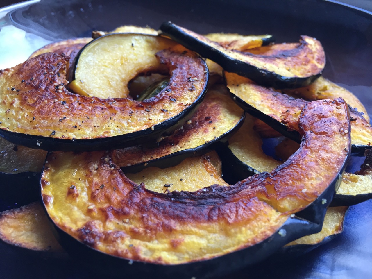 Note: The Yummy recipe called for 325, but we found that temperature too low to brown the acorn squash sliced. We found 375 to be the correct temperature in our oven.