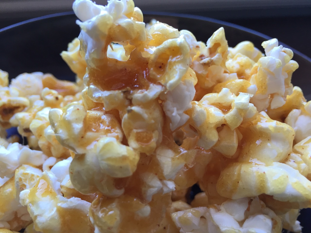 Caramel corn with a dash of cayenne. Recipe from Smitten Kitchen: http://smittenkitchen.com/blog/2009/12/spicy-caramel-popcorn/. My modifications: Rather than pop ½ cup kernels on the stovetop, I used two regular sized bags of Newman’s Natural microwave popcorn. I reduced salt to 1 ½ tsp (the recipe calls for 1 to 1 ½ Tbsp) and used ½ tsp cayenne. Also, it was hard for me to tell when the caramel was finished cooking by color, but 10-15 mins was the right amount of time. (Oct. 2015)