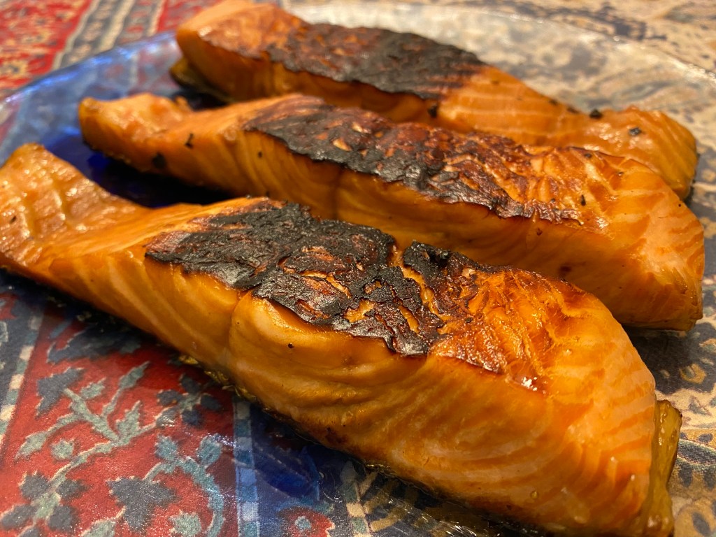 I learned this recipe from Waimar and her father. Marinate four salmon fillets (about 24 oz) in approximately ¼ cup low sodium soy sauce, 1/3 cup mirin, 2 tsp honey, and 1 tsp black pepper for about 30 mins. (Oct. 2015)