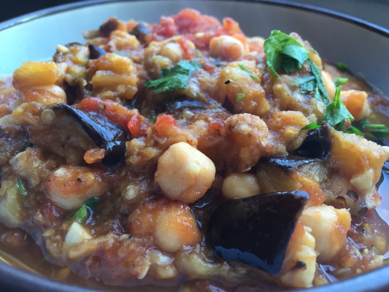 The key ingredient is pomegranate molasses. Recipe from Martha Rose Shulman at the NYT: http://cooking.nytimes.com/recipes/1013763-sweet-and-sour-eggplant-tomatoes-and-chickpeas I added juice from half a lemon at the end for brightness. (Nov. 2015)