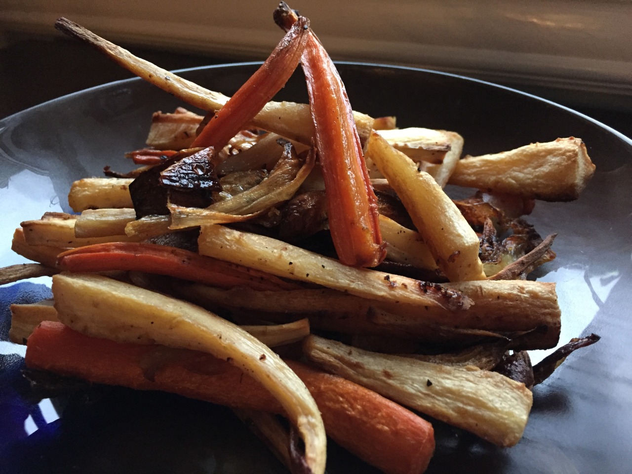 Preheat oven to 350. Peel 1 ½ lbs parsnips (about 9 parsnips) and ½ lb carrots (about 3 carrots) and cut them into vertical pieces (I cut the parsnips into vertical quarters and the carrots into vertical halves to make the root vegetables as uniform as possible, but it depends on the size and shape of yours). Peel and cut about 6 shallots into ½ inch-thick slices. Spray a cookie sheet with olive oil, then add the parsnips, carrots, and shallots, spreading out in a single layer. Drizzle with olive oil and sprinkle with salt and pepper. (I also sprayed additional olive oil for pieces that looked untouched by the olive oil drizzle.) Bake at 350 until browned and crisp (about 1 hour 50 mins), turning over the vegetables midway to ensure both sides brown. We roasted these vegetables one row below, and during the second half of cooking, our roast turkey for Thanksgiving. (Nov. 2015)