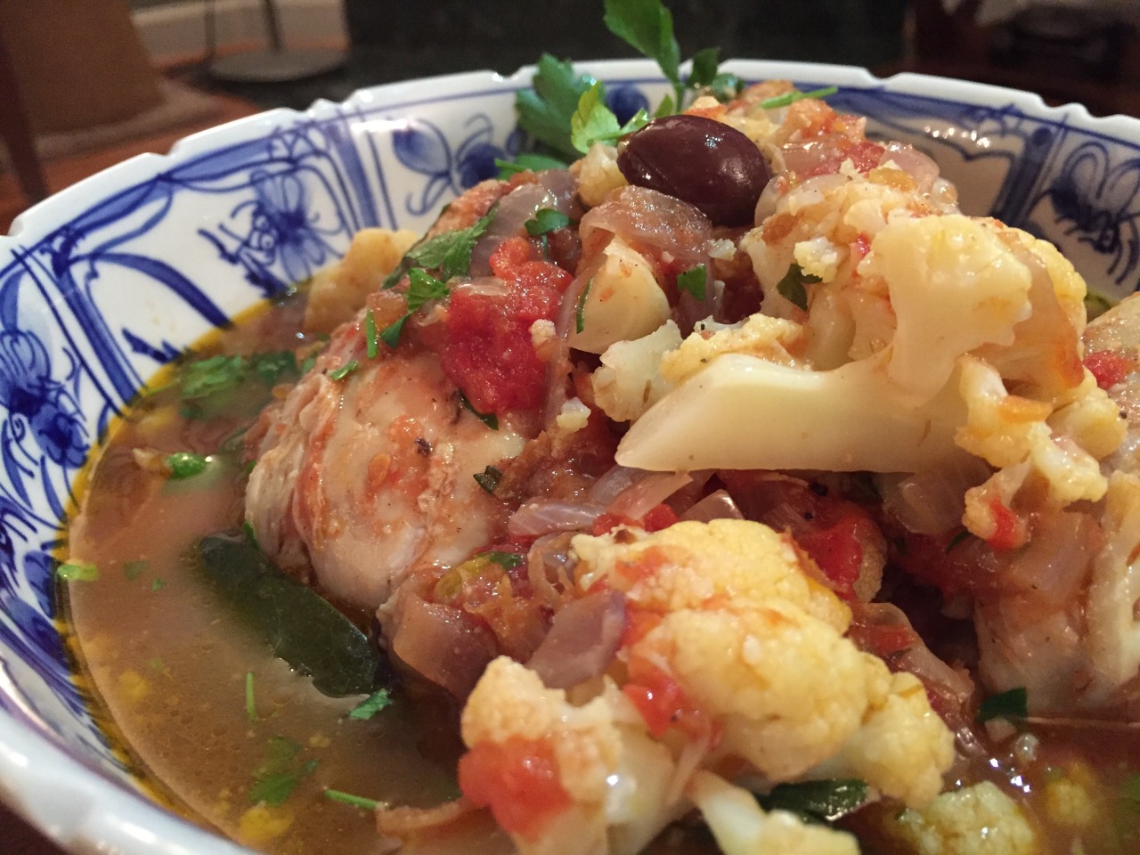 Recipe here: http://cooking.nytimes.com/recipes/12308-greek-chicken-stew-with-cauliflower-and-olives. Instead of ½ tsp cinnamon, we used ¼ tsp each cinnamon and nutmeg, and we added a bay leaf. We served this with Greek spinach rice with dill (spanakorizo); recipe here: http://piglettedc.tumblr.com/post/114321759431/greek-spinach-rice-with-dill-spanakorizo-recipe. (Nov. 2015)