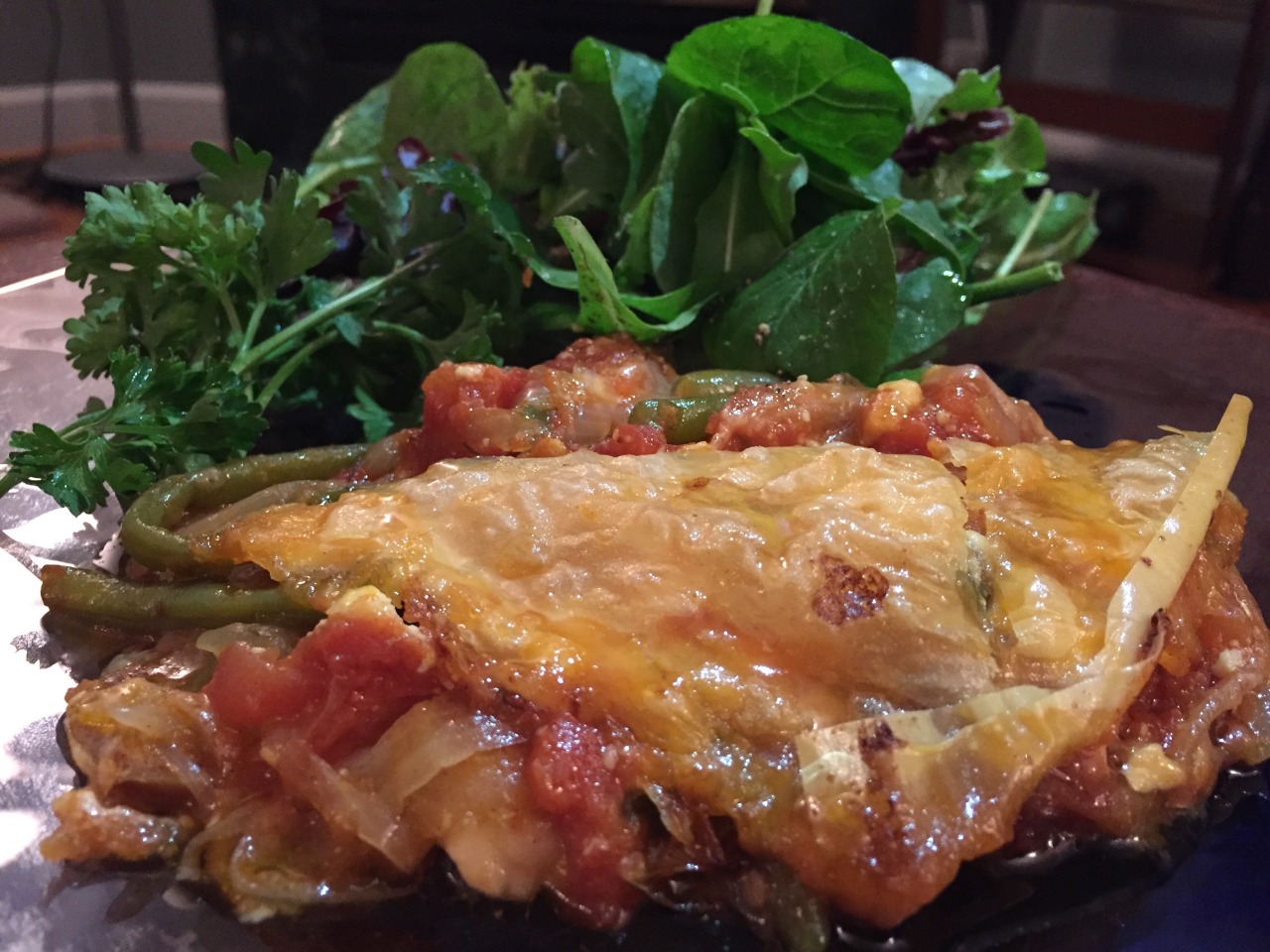 Chef Maria Elia’s recipe has Greek notes like fresh dill, cinnamon, feta, and honey. Recipe here: http://www.foodrepublic.com/recipes/tomato-and-string-bean-baklava-recipe/. Our only modification is instead of 2 tsp cinnamon, we used 1 tsp each cinnamon and nutmeg. We also had to bake it 20 mins longer and at a higher temperature (we raised it to 375/400 for the last 20 mins) to get the phyllo to brown. I suspect I over-buttered each phyllo sheet, and that’s why it wasn’t browning well at first. (Dec. 2015)