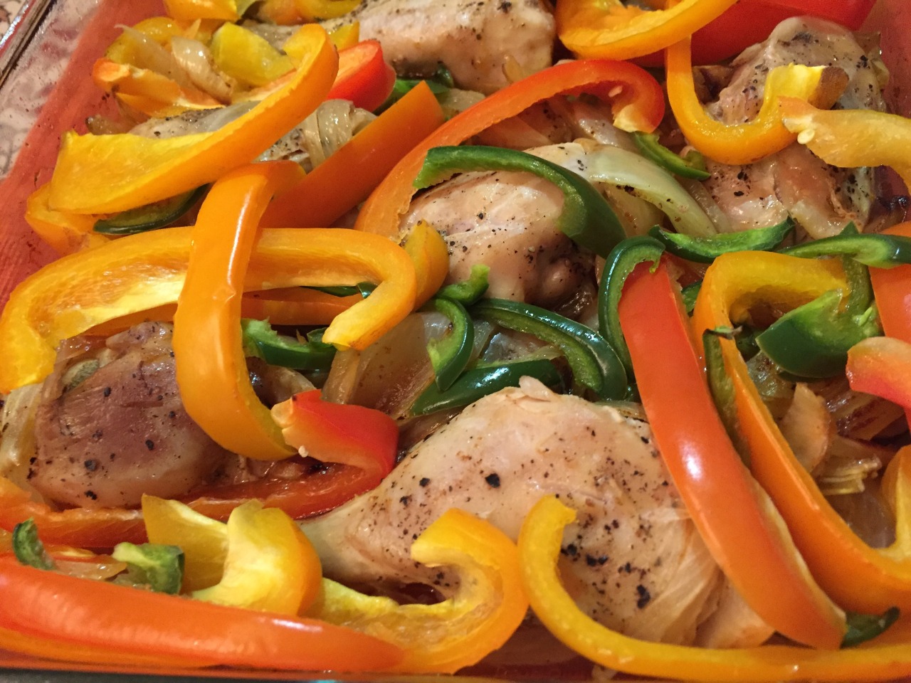 Preheat oven to 400. Season 2 ½ lb skinless chicken drumsticks with salt, black pepper, and ½ tsp paprika. Lightly oil a 9×12 baking dish, then place the chicken in the dish. Top with 2 large sliced onions and 4 rosemary sprigs, then cover with foil and bake for 30 mins. Reduce oven to 350. Core and slice 2 bell peppers (red and orange) and 2 jalapeños, and toss into the dish (be sure to submerge the jalapeño slices in the chicken braising liquid). Turn over the chicken. Add 1-2 Tbsp water if chicken seems dry. Bake at 350 until chicken is fully cooked (about 20 mins). We served this with jasmine rice and a simple salad. This recipe is from Healthy Cooking for the Jewish Home by Faye Levy. (Dec. 2015)