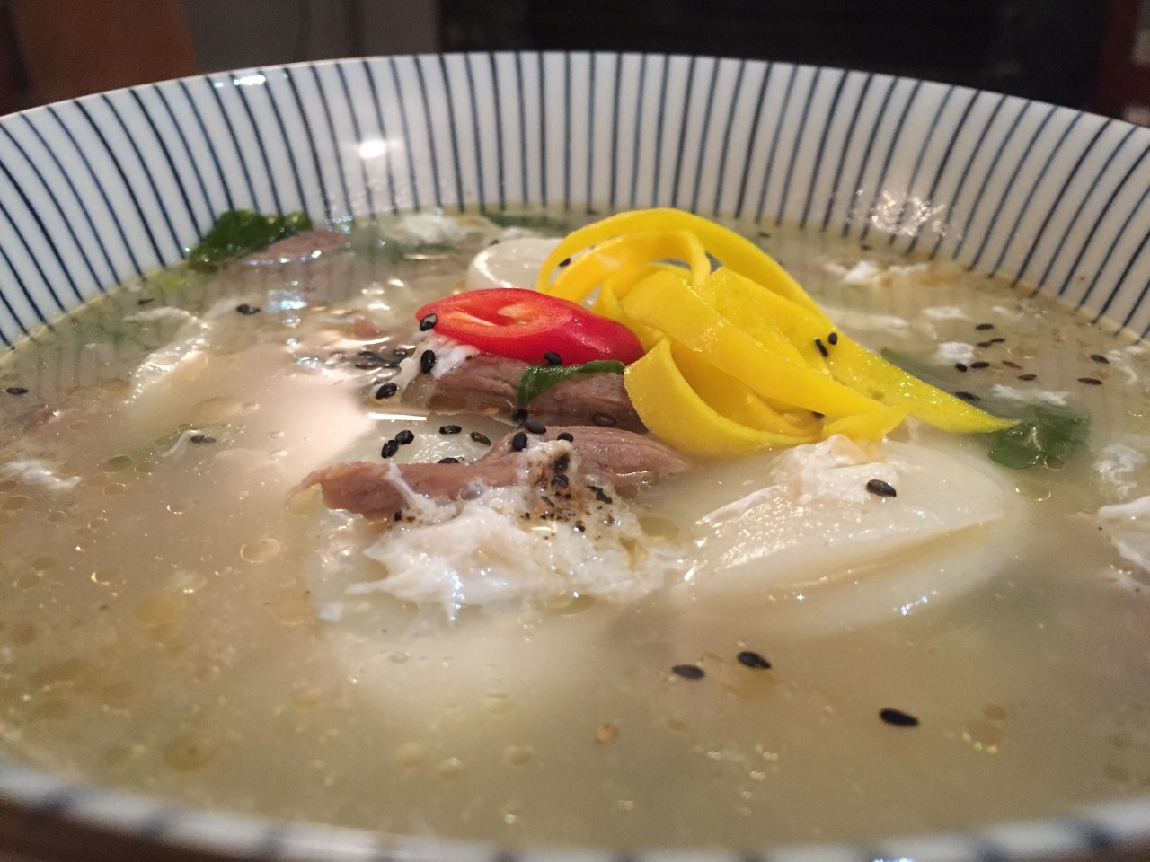 This is a favorite from my childhood. I made this recipe from Maangchi, but I used skirt steak instead of brisket: http://www.maangchi.com/recipe/ddukguk. I modified by sautéing the beef strips before adding the hot water and garlic (but see Note below). I also used black sesame in lieu of toasted nori. We also have added a tsp of Korean beef bouillon powder (sogogi dashida) to taste at the end of cooking. (Dec. 2015)