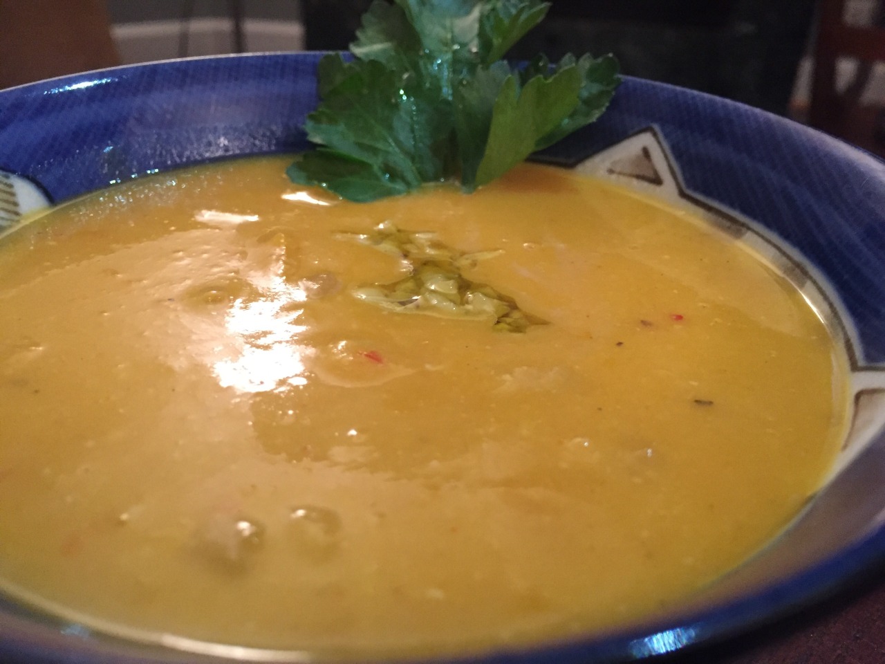 Using a large Dutch oven, sauté one chopped onion in 2 Tbsp olive oil until tender and fragrant. Add 6-7 cups peeled and chopped pumpkin or butternut squash (here, the latter), lightly season with salt and black pepper, and sauté for about 3 mins. Add 1 cup of drained and rinsed red lentils and 6 cups of water or broth (here, low sodium chicken broth). Bring to a boil, then reduce to a simmer, cover, and cook until pumpkin/squash is tender (about 25 mins). Mash the pumpkin/squash with a spoon (I used an immersion blender, leaving about 1/3 chunky), then add ½ tsp crushed red pepper flakes, ¾ tsp cumin, and the juice of one lemon. Separately, mince 5 cloves garlic, then mix with a pinch of salt in a mortar and pestle. Using a small saucepan, heat 3 Tbsp olive oil, then add the garlic-salt mixture, sautéing until golden (be careful not to burn). Serve the soup, garnishing with the garlic mixture. This can be vegetarian if you use water or vegetable broth. This recipe is from The Gaza Kitchen by Laila El-Haddad and Maggie Schmitt (Jan. 2016)