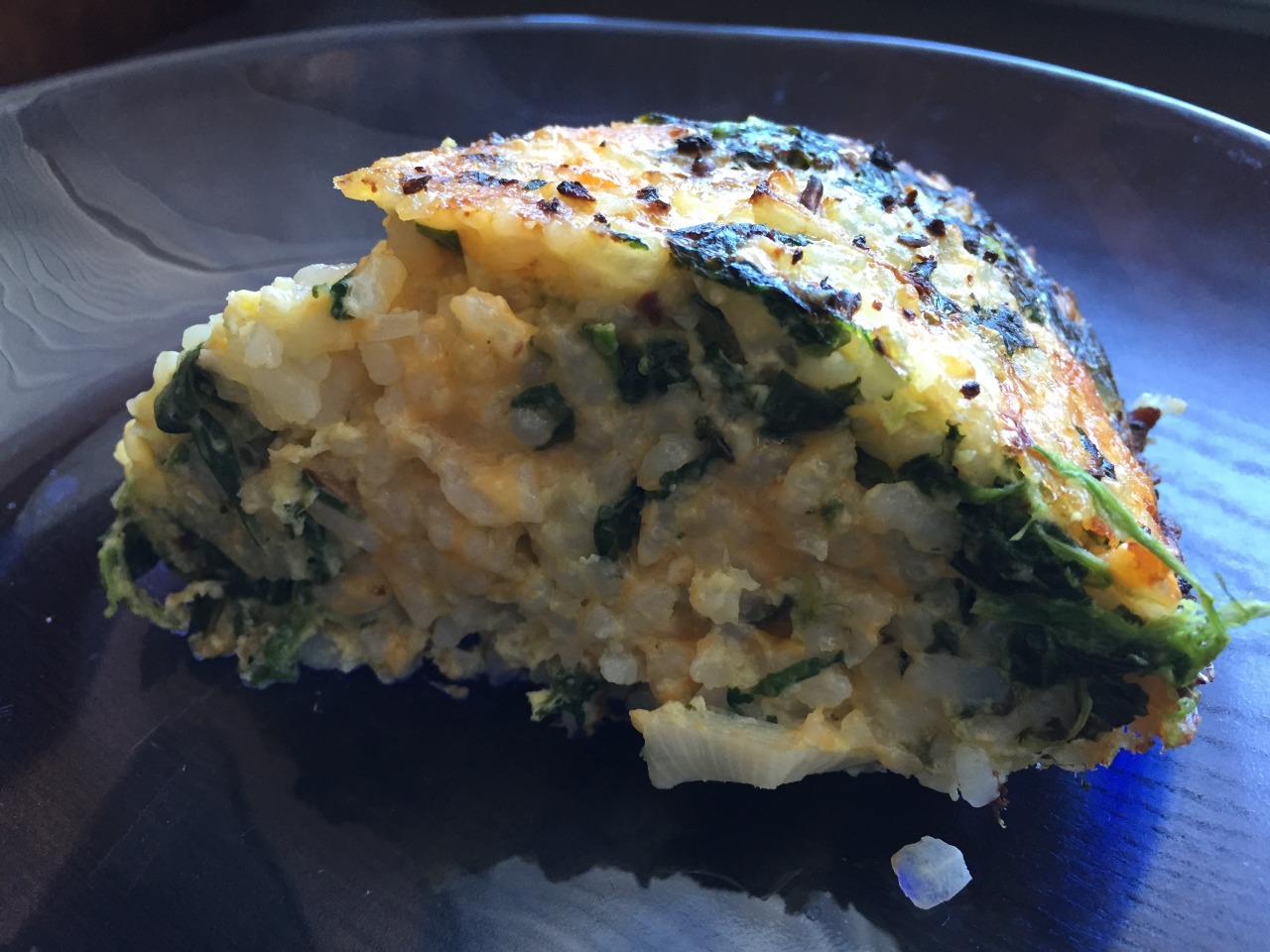 We had leftover cooked rice and a lot of frozen spinach, so we decided to try this recipe. We used shallots instead of onion (see Note 2 below) and added a dash of marash pepper for a little heat. We also used haiga (Japanese medium-grain) rice. After baking in a buttered 2 quart baking dish at 350 for 45 mins (even if inserted knife has some liquid), we browned it under the broiler on high (about 8 inches from broiler) for a few mins, and then let settle at room temperature for about 5-10 mins before serving. This way, the casserole continues cooking ambiently but remains moist inside. http://www.shockinglydelicious.com/spinach-rice-casserole/ (Jan. 2016)