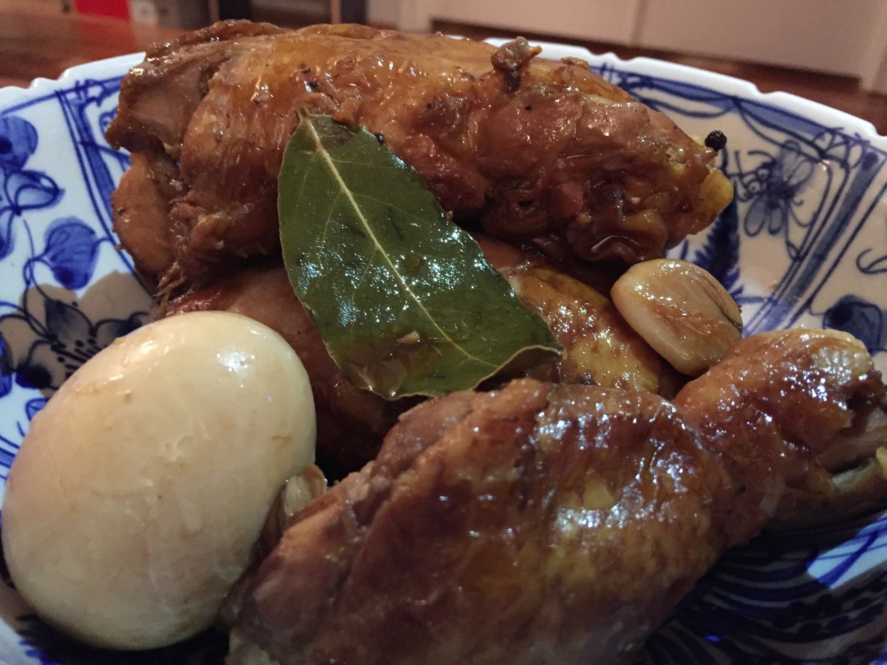 We tried a modified version of Classic Chicken Adobo from Marvin Gapultos’ Adobo Road Cookbook: http://www.seriouseats.com/recipes/2013/05/classic-chicken-adobo-adobo-road-cookbook.html, with the following modifications: (1) slightly over ½ cup soy sauce, (2) 1 cup white vinegar, and (3) two thighs, drumsticks, and wings (each skin-on and bone-in). We also added 6 peeled, hard-boiled eggs to the pot for the last 10 mins of cooking the adobo. (Jan. 2016)