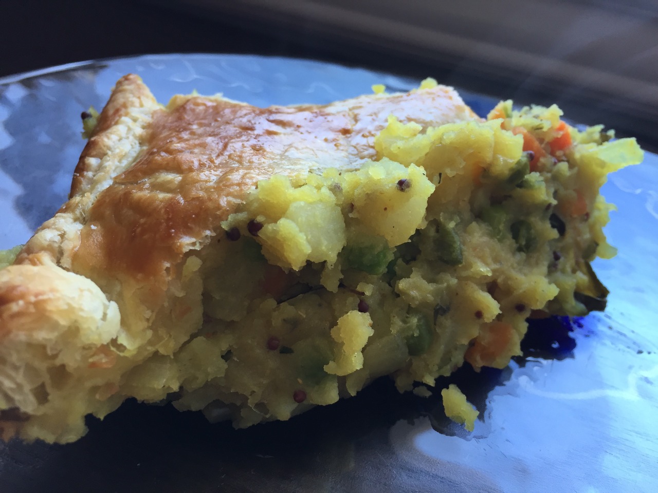 We followed this recipe from The Vegetarian Times, with significant modifications: http://christinehennessey.blogspot.com/2009/12/indian-samosa-casserole.html?m=1. First, we added ½ tsp each turmeric and paprika, ½ chopped jalapeño pepper, 1 Tbsp chopped fresh cilantro, and 8 curry leaves to the filling. We also used chicken broth instead of vegetable broth and sugar instead of agave nectar. We tasted the filling before assembling the casserole and added more salt (about 1 tsp). For the topping, we used a single sheet of puff pastry instead of pie crust. In doing so, we followed the puff pastry baking instructions for Foodess’s Samosa Pie, available here: http://foodess.com/recipes/samosa-pie/ We baked the casserole at 400 degrees until the crust was nicely browned (25-30 mins). (Jan. 2016)