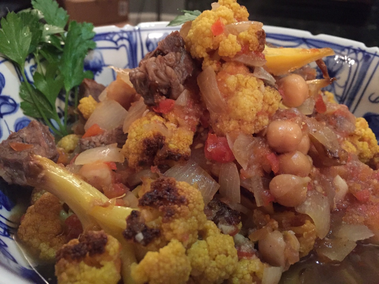 Second, prepare the stew: Cut 1 small head cauliflower into bite-sized florets, then toss with ½ tsp cumin and some olive oil (I used about 2 tsp). Place the cauliflower on a cookie sheet, then roast at 375 for about 30 mins. In the mean time, purée 5 ripe tomatoes in a food processor, then set aside. Heat 2 Tbsp of olive oil in a large Dutch oven, then sauté 1 chopped onion until browned. Add the tomato purée and stir until the color turns slightly orange. Add 4 cups of maraqa stock (above), all of the chopped beef, 28 oz canned chickpeas (drained and rinsed), and 1 tsp salt. Bring to a boil, then add the roasted cauliflower. Simmer until cauliflower is heated through, then turn off heat. Separately, make the garlic topping (tiqliya): crush 5 cloves garlic with ½ tsp salt. Heat 2 Tsp olive oil in a small pan, then add the garlic mixture. Add ½ tsp cumin, stirring until fragrant. Fold the tiqliya into the stew. Serve with basmati rice and the Palestinian minced salad.