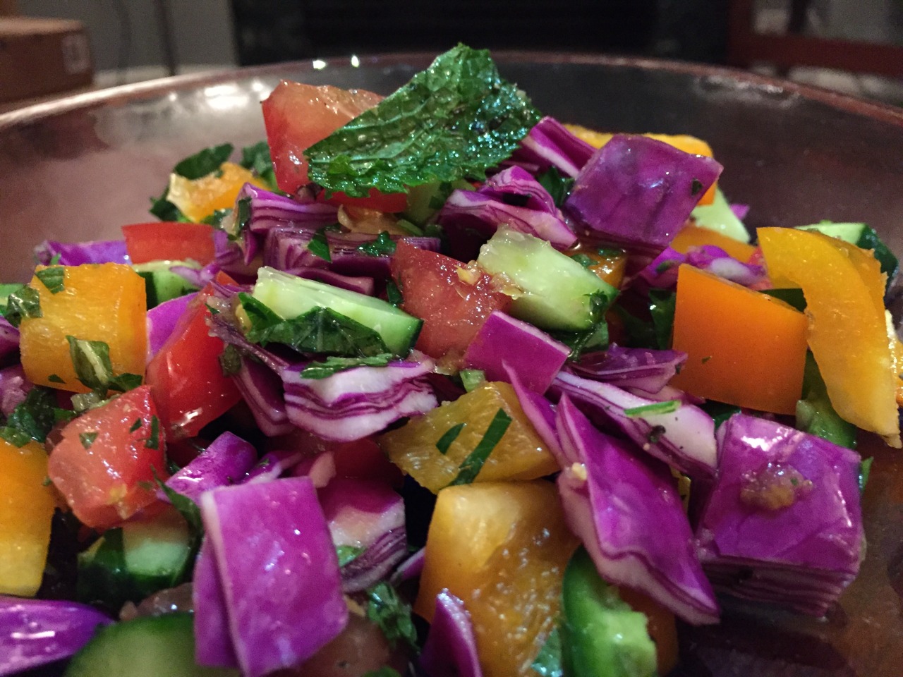 Chop into bite-sized pieces: 3 firm tomatoes (I removed the juicy insides), 4 Persian cucumbers (or 2/3 large English cucumber), 1 yellow or orange bell pepper, 1 cup red cabbage, and 2-3 jalapeño peppers (I used 2, cut them in vertical halves and into ¼ inch half-moons). Combine all of those vegetables in a large mixing bowl and add ½ cup each minced fresh spearmint and Italian parsley. Separately, mash 1 clove garlic with a dash of salt in a mortar and pestle, then add zest from one lemon. Fold the lemon zest mixture to the mixing bowl, and season the salad with ½ tsp salt and ¼ tsp black pepper. Drizzle the juice of 2 lemons and 2 Tbsp olive oil, then serve; alternatively, serve with the lemon juice and olive oil on the side so that guests can add dressing to taste. Recipe from The Gaza Kitchen by Laila El-Haddad and Maggie Schmidt, available on Amazon: The Gaza Kitchen: A Palestinian Culinary Journey https://www.amazon.com/dp/1935982230/ref=cm_sw_r_cp_awd_UmLjxbD2FAAEH